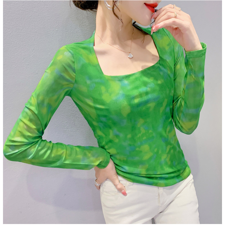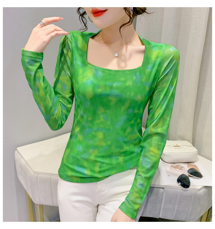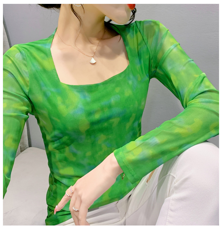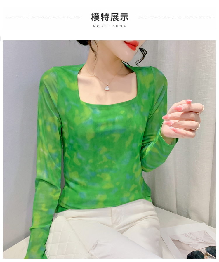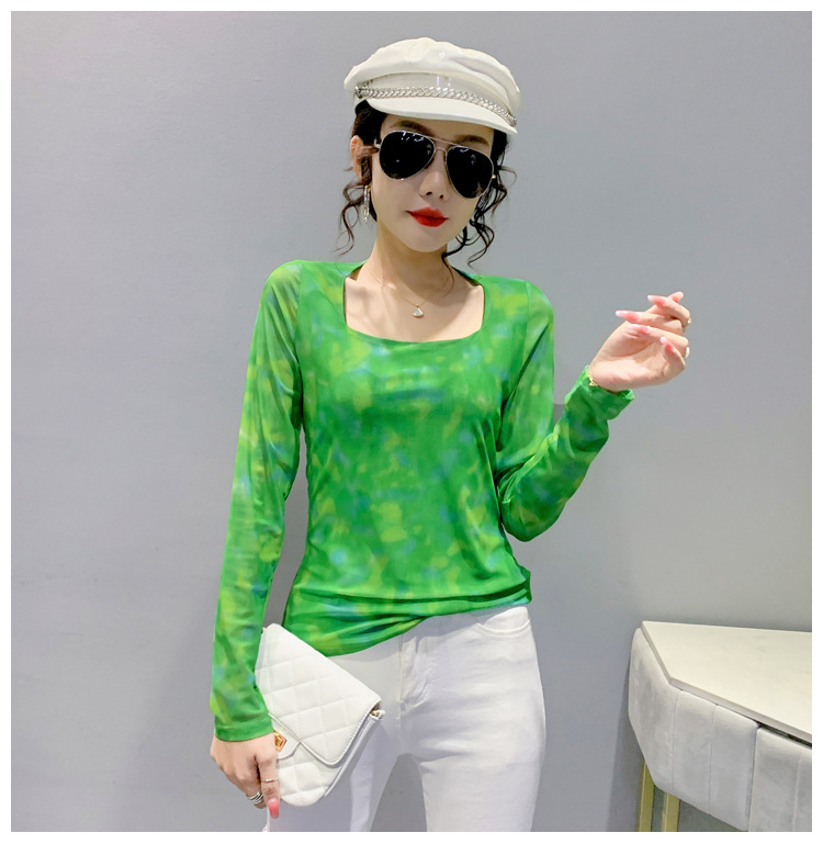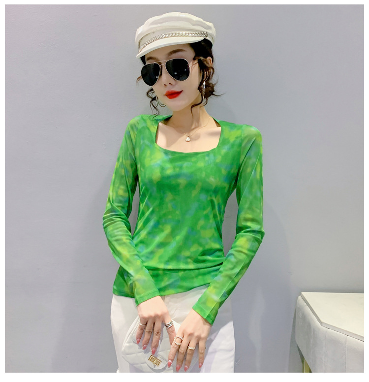 设计感方领修身打底衫,洋气晕染网纱T恤KQL-9120