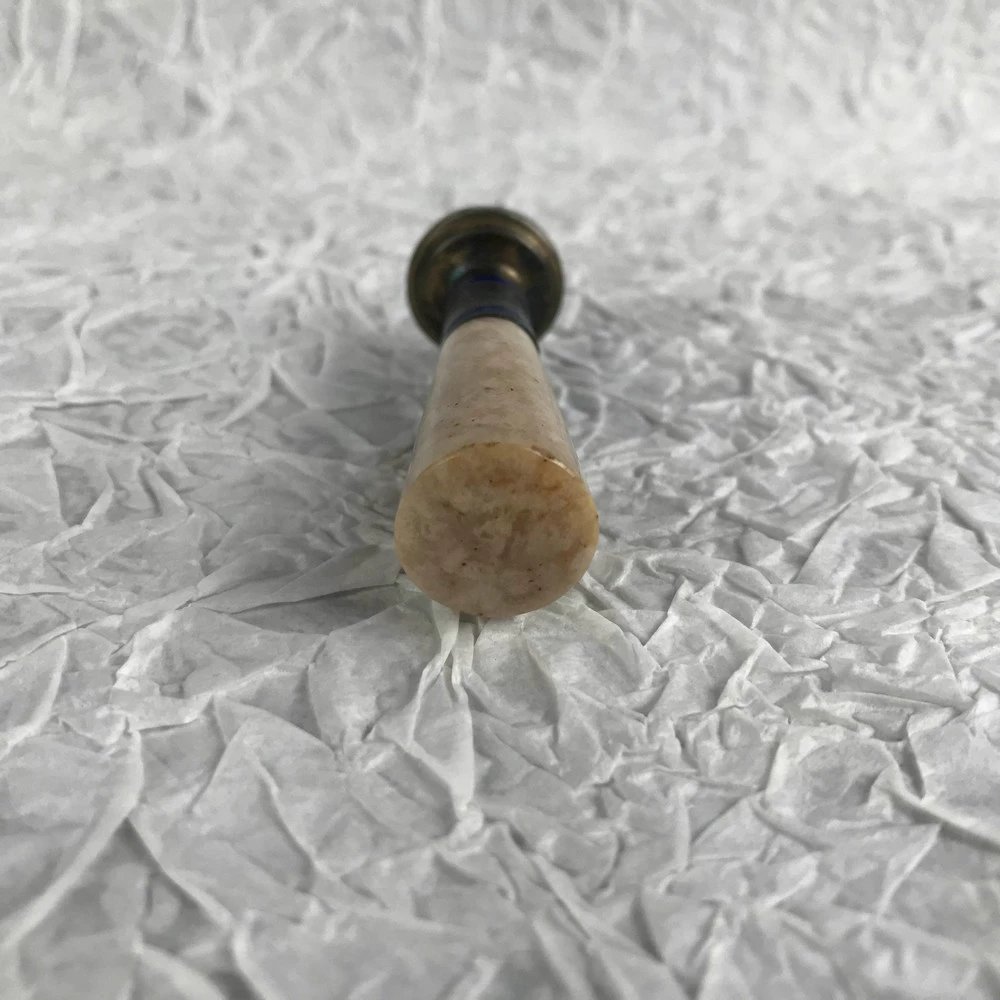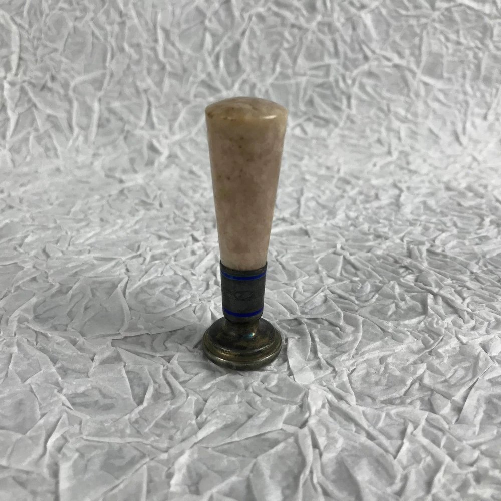 此枚火漆印章光润有质感,底部纹饰为花体字母,有一定磨损的痕迹和年代感,权柄下端为其他材质雕刻有细小的花纹,比较独特。。