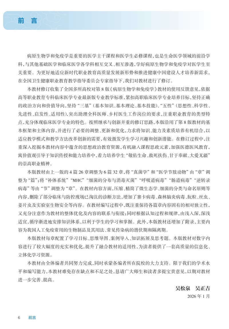 本教材修订根据第九轮修订相关要求以及全国多所高校对第8版《病原生物学和免疫学》教材的使用反馈,依据高职专科临床医学专业教学标准,紧扣高职临床医学专业培养目标,坚持正确的政治方向和价值导向,坚持“三基”(基本知识、基本理论、基本技能)、“五性”(思想性、科学性、先进性、启发性、适用性),突出助理全科医师、乡村医生工作岗位的服务面向,注重职业教育的类型特点,充分体现高职临床医学的专业特色,推动教材的形态创新和信息化。按照继承与创新并重的修订思路,本版沿用了第8版的基本框架和主体内容,并进行了必要的调整、更新和优化,力求将知识、能力及素质培养有机结合,适应教学模式和教学方法改革创新的需要,有效激发学生学习兴趣和创新潜能。