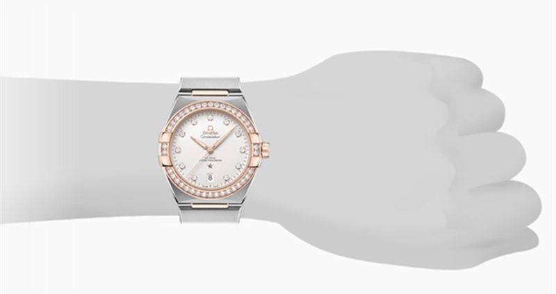 镜面材质 | 蓝宝石水晶玻璃 | 表盘 | 精钢与Sedna@18k金镶钻表壳 浅银色表盘上饰有钻石小时刻度,6点钟位置设有日历窗。指针、欧米茄品牌标识、星座徽标以及表盘上的钻石托槽均以Sedna 18K金打造。 透底 |