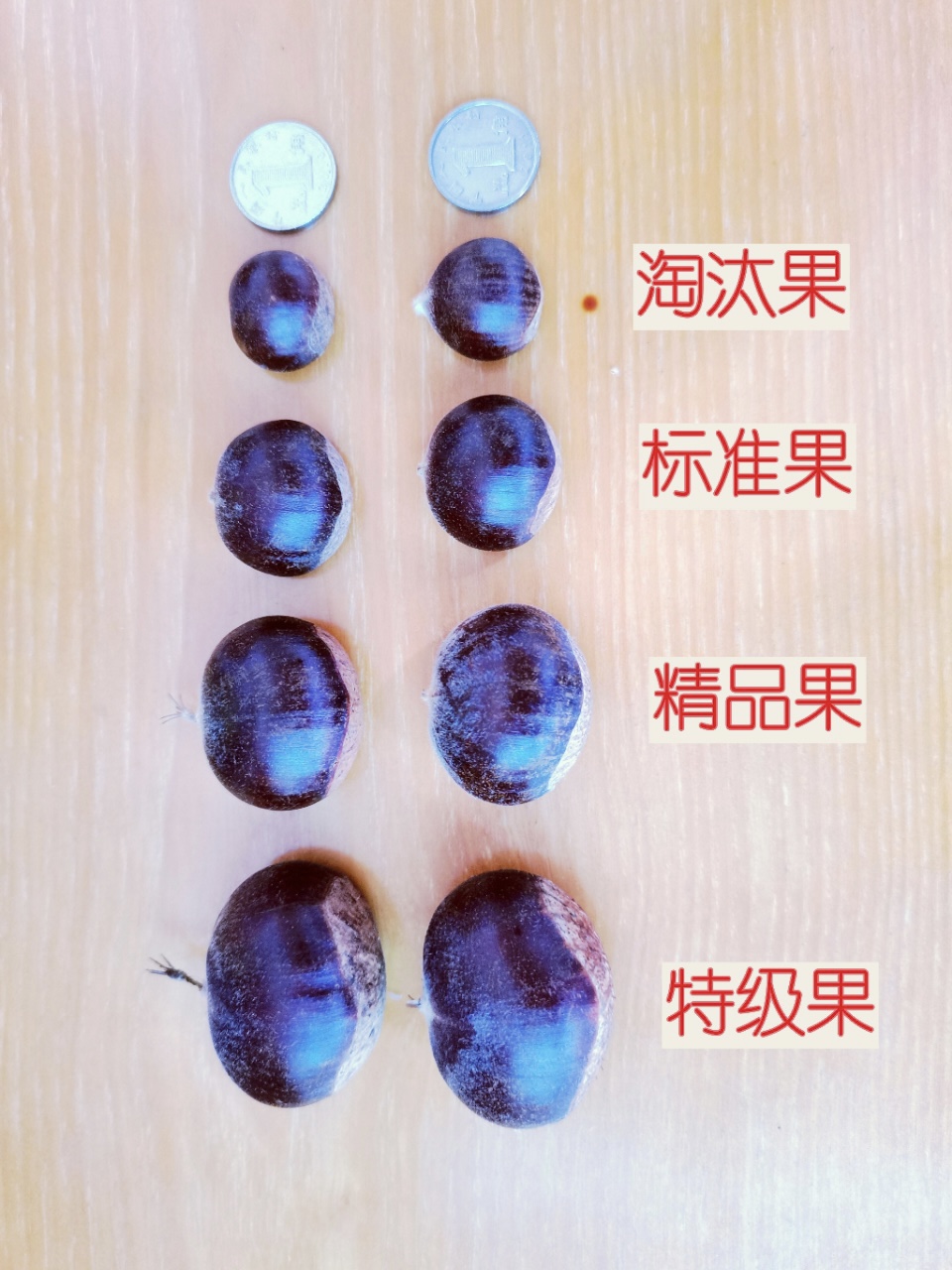 根据多年客户反馈的需求,2021年我们按板栗颗粒大小分成三个等级销售。个头最小的板栗由于不饱满的比例无法避免,故我们不会销售。三个等级分别是:标准果(标准大小)、精品果(大颗粒)、特级果(特大颗粒)。请大家根据自己的喜好选择