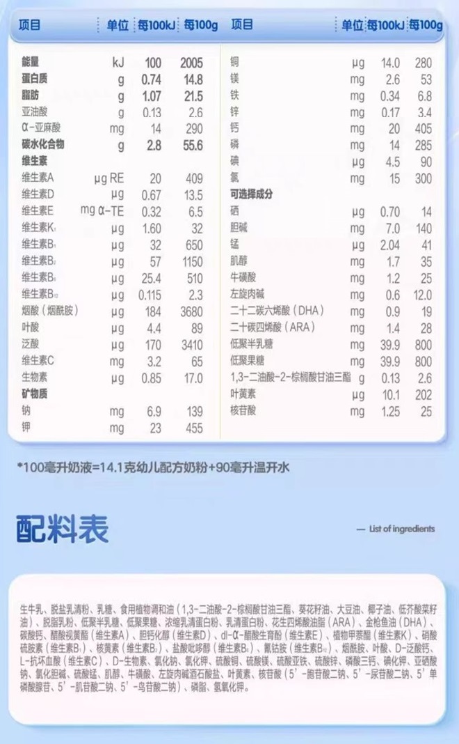 1.第一原料为优质“生牛乳”,但“脱脂乳粉”位于配料表第5位。本品非全生牛乳原料制造;