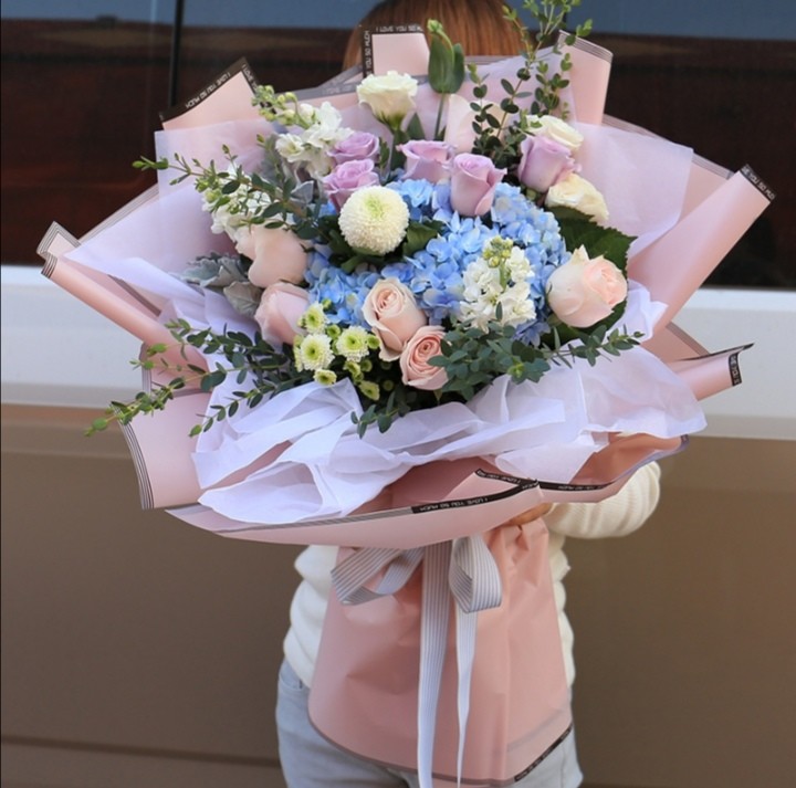 花材:蓝色绣球一个,14朵香槟玫瑰,5朵紫玫瑰,乒乓菊,尤加利,桔梗搭配