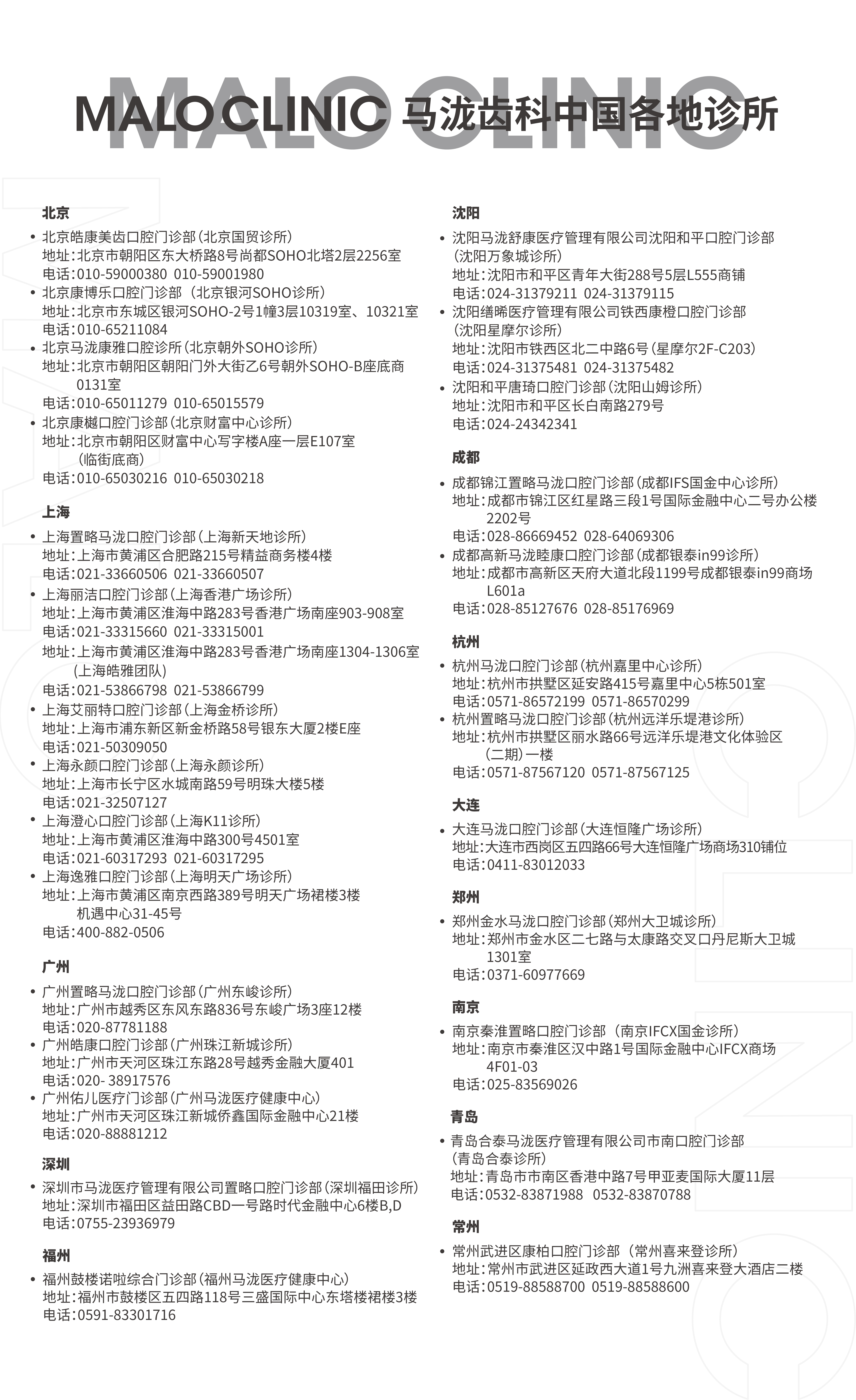 马泷齿科·中国【官方商城】: 马泷齿科作为牙科种植和口腔美学修复领域的世界领导者,拥有一支由齿科医学各领域专家组成的专业牙科医疗团队,并配置国际顶尖的医疗设备,为患者提供最贴心优质的标准化服务。马泷齿科在全球拥有100余家连锁齿科诊所,让世界各地的口腔患者重获健康自信的笑容。 全国统一预约:400-882-0506