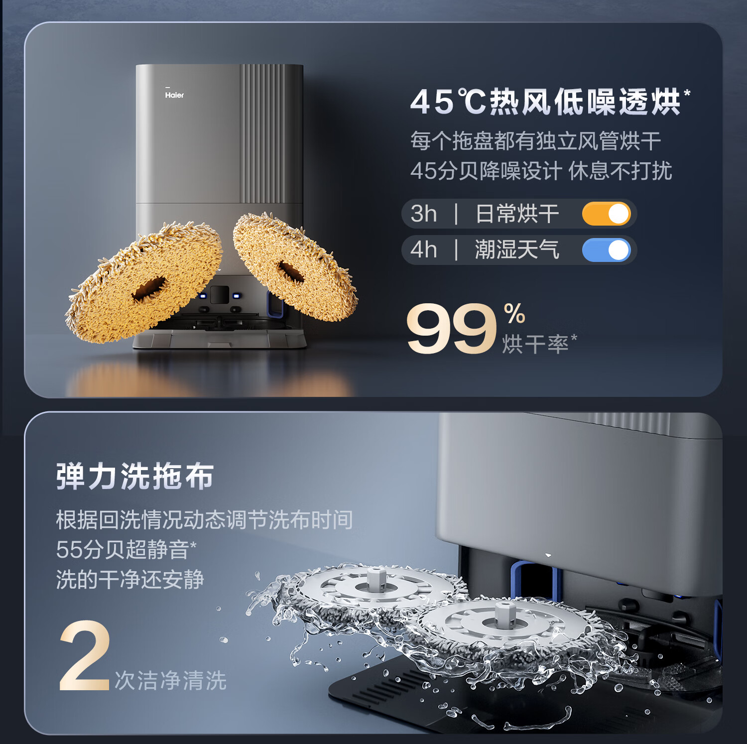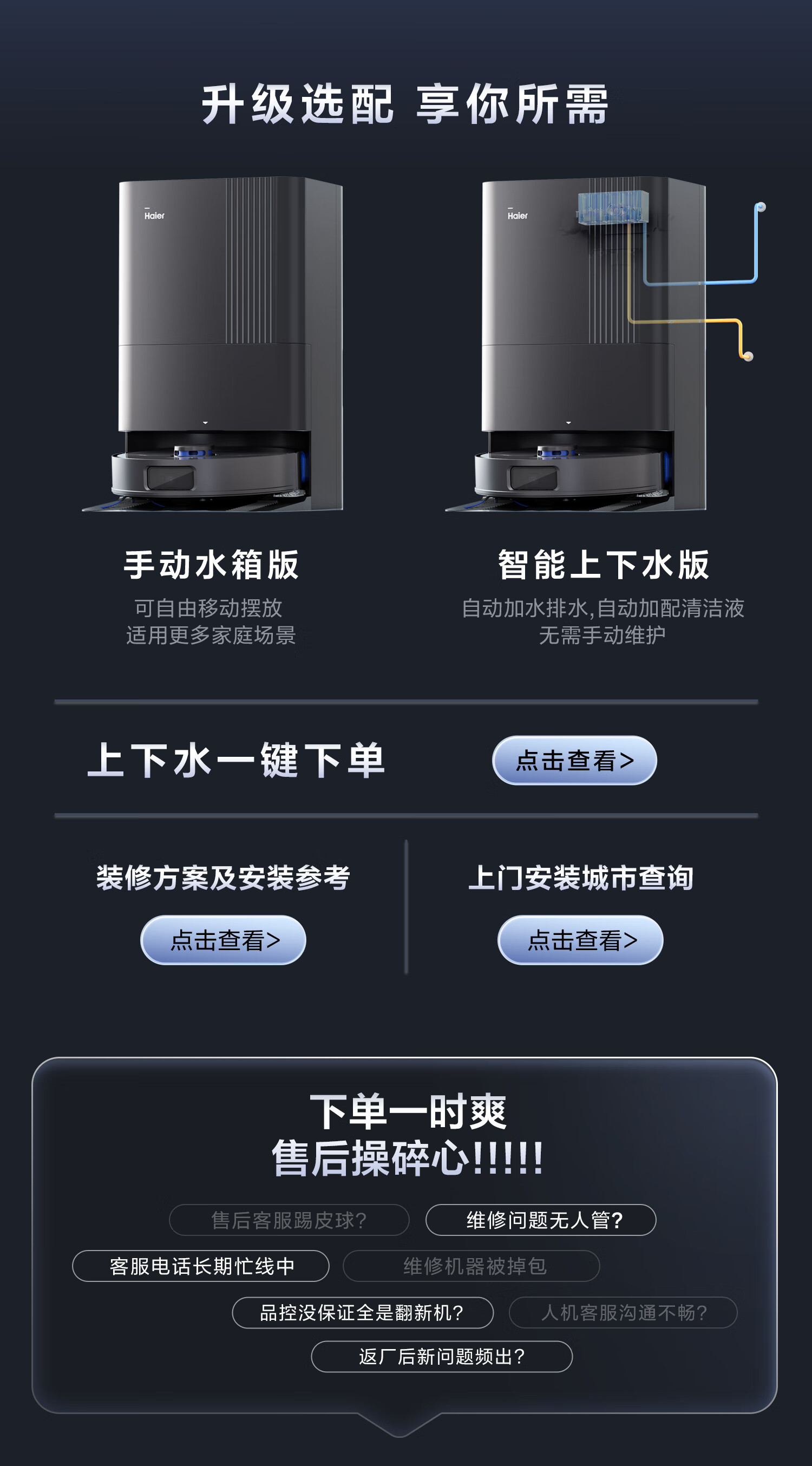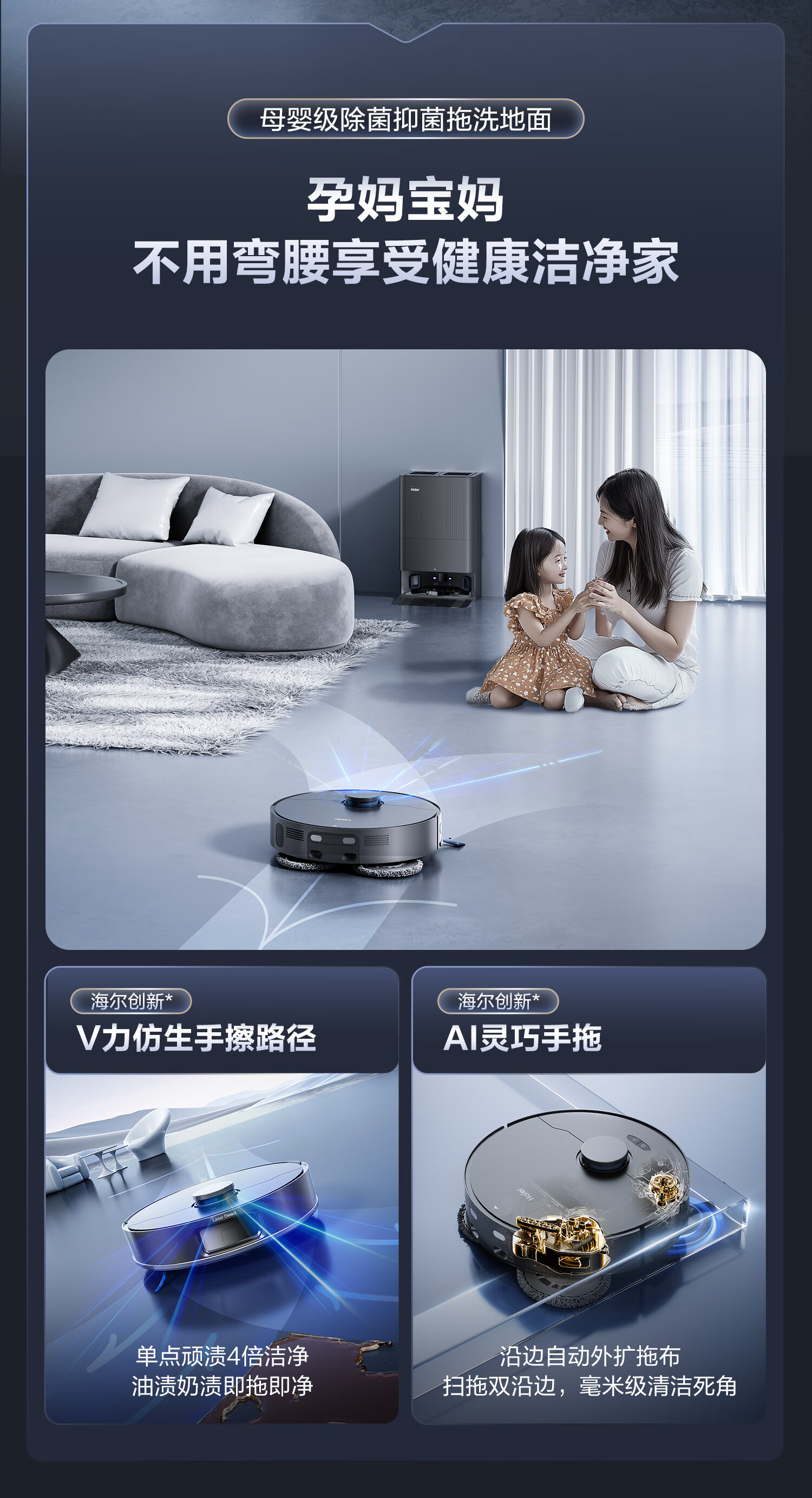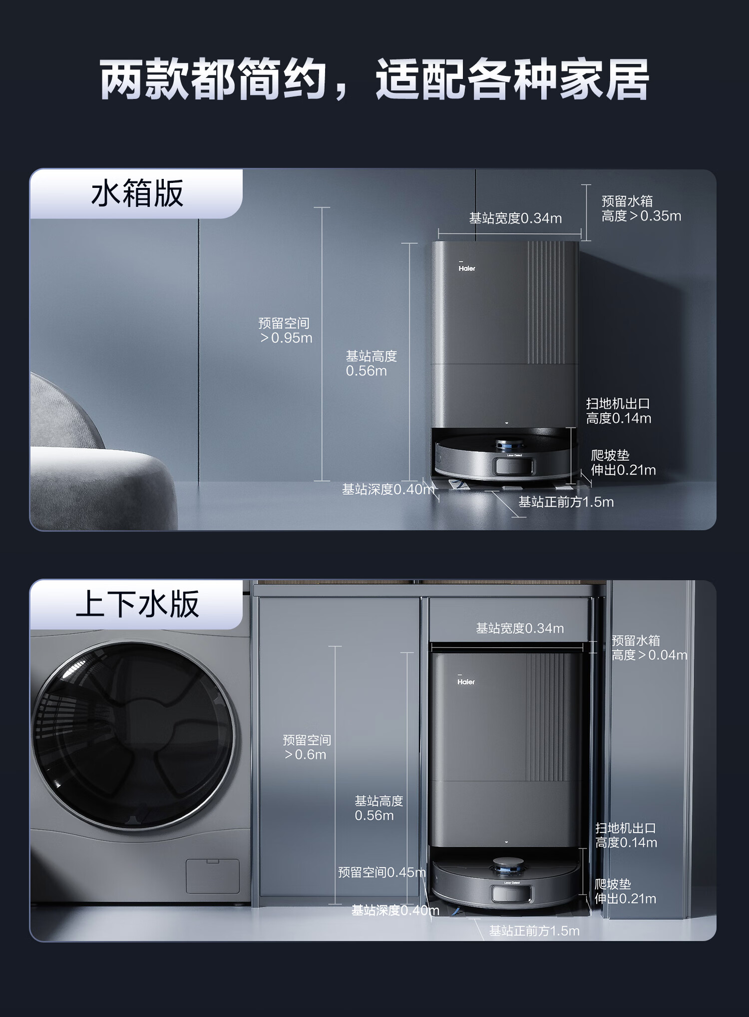 海尔V3S扫地机器人 热风烘干 加压搓洗 LDS激光导航0缠毛滚刷 母婴级除菌智能家用全自动扫吸拖一体机 【智能上下水版】博卡灰V3S+上下水组件
