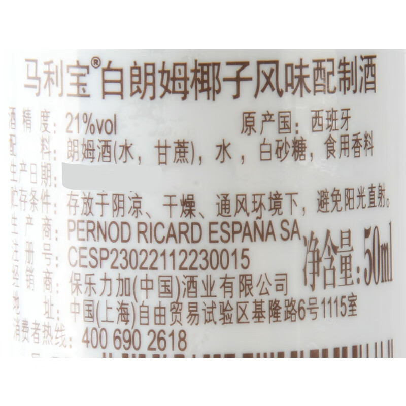 马利宝白朗姆椰子风味配制酒_21%vol_50ml