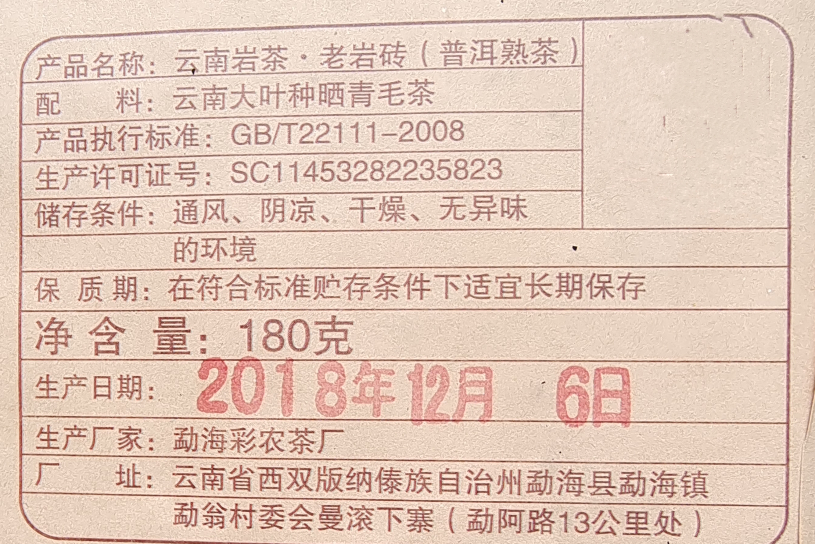品名:彩农茶|云南岩茶2018年老岩熟砖