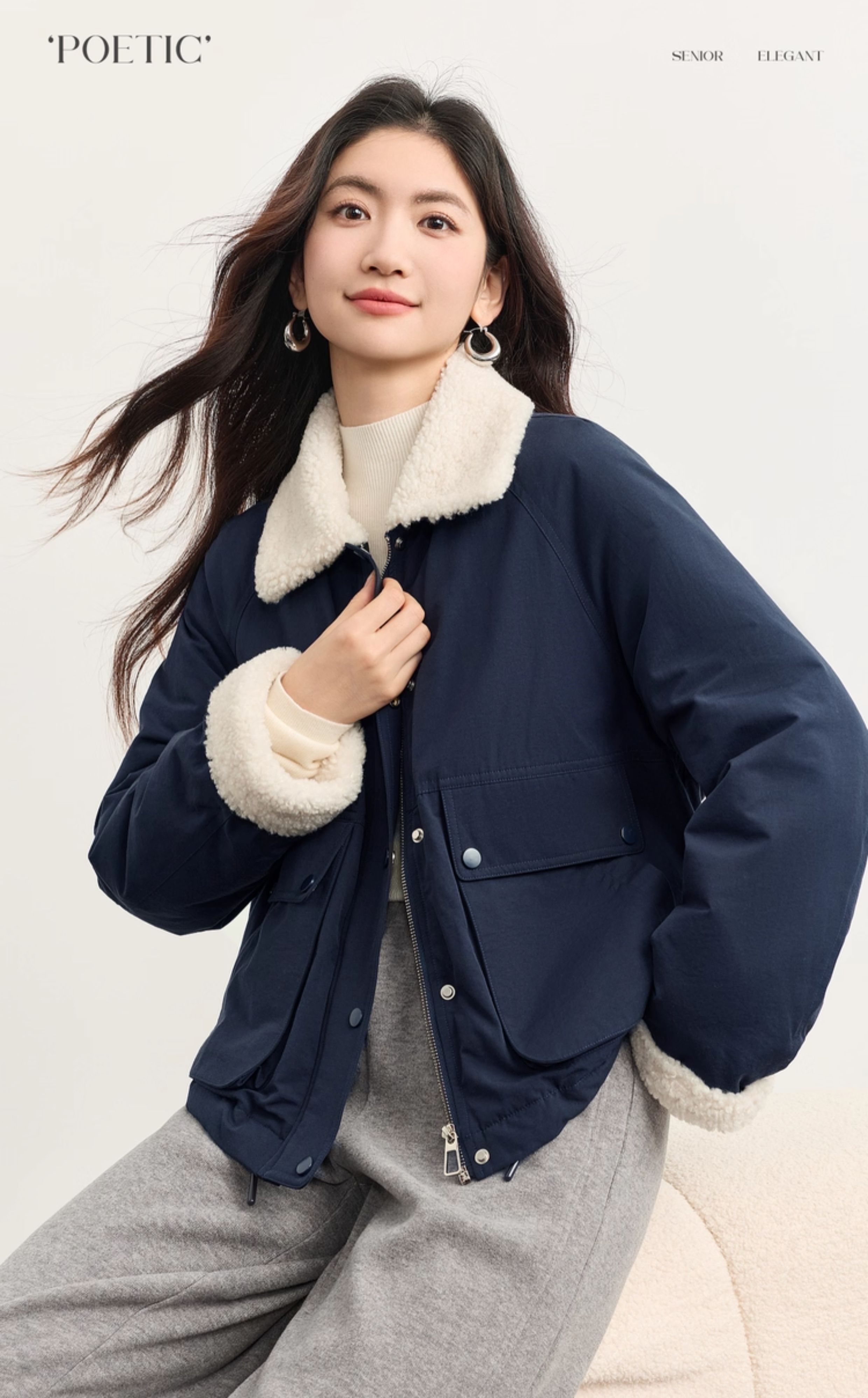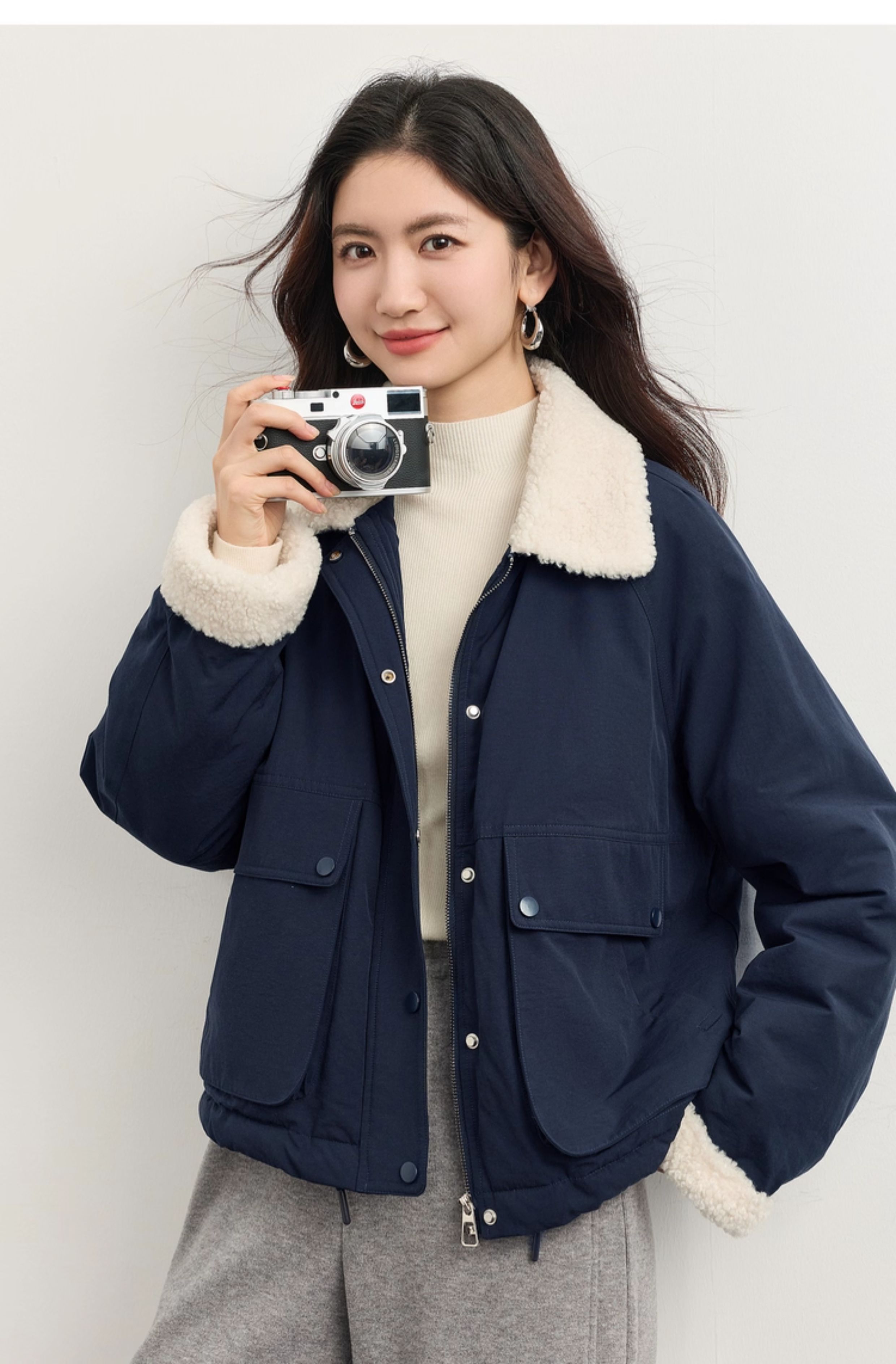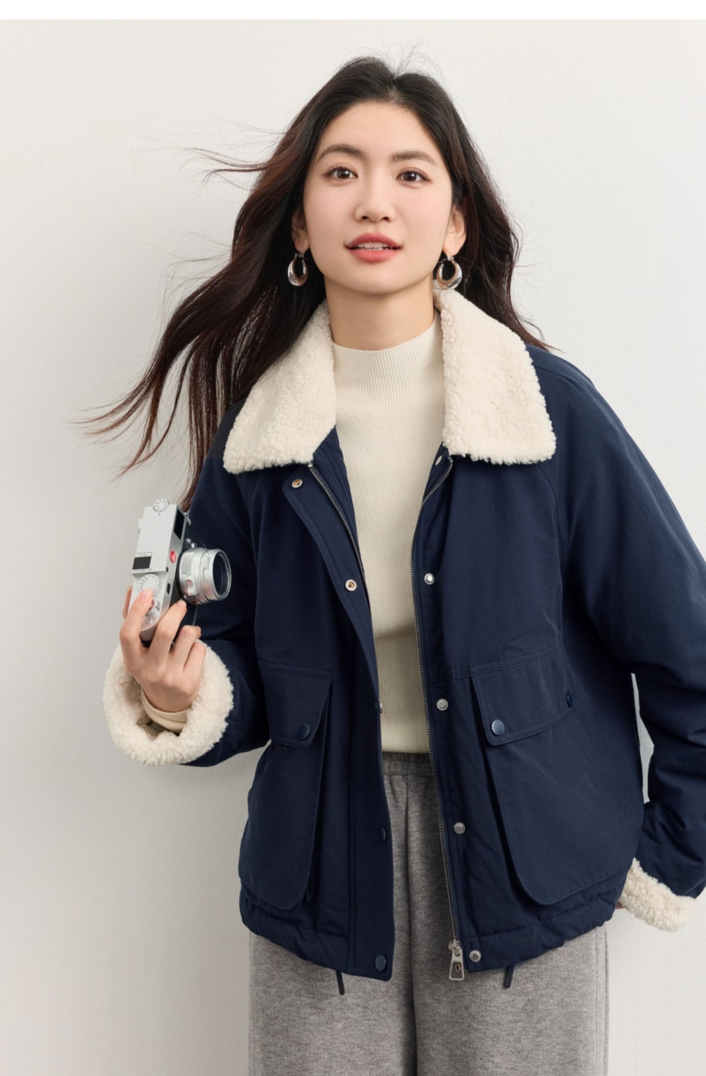 【年货节】熙世界工装巴恩风毛绒翻领羽绒服女冬2025新款大口袋白鸭绒短外套