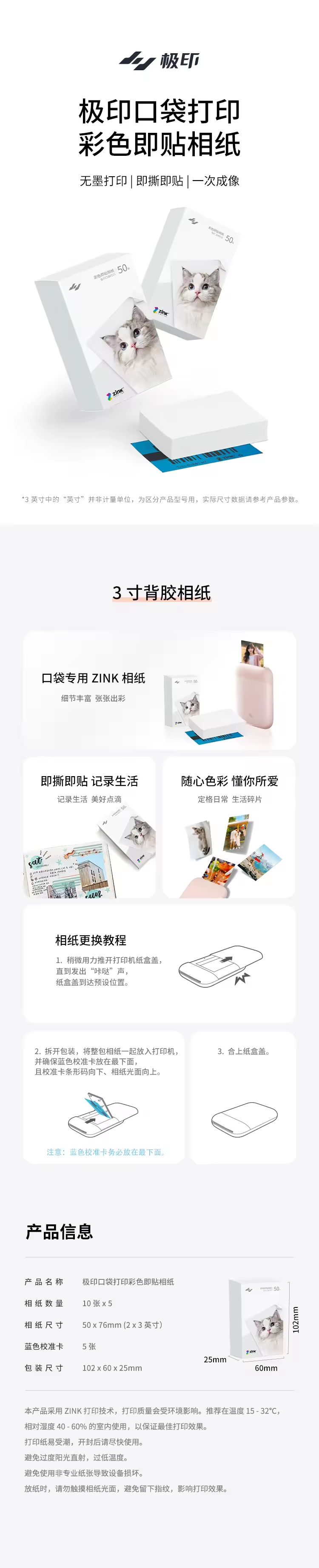 JIYIN 极印 口袋照片打印机 N1 耗材 3 寸彩色相纸 50 张装