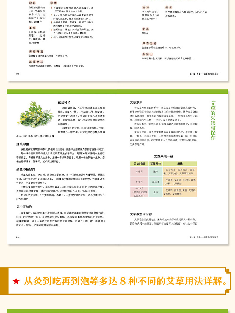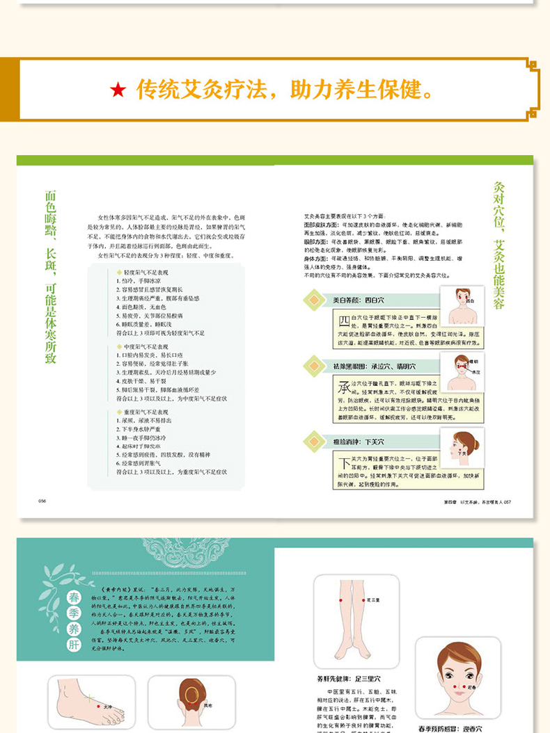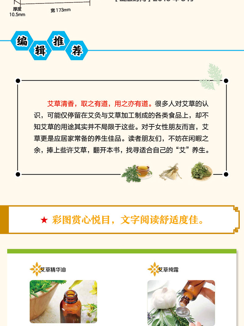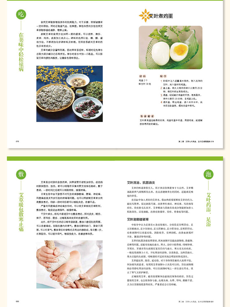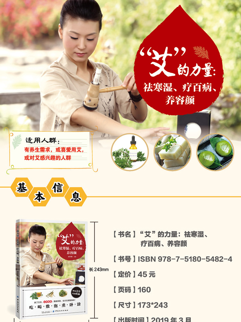 开 本:16开纸 张:胶版纸包 装:平装-胶订是否套装:否国际标准书号ISBN:9787518054824 所属分类: 图书>保健/养生>中医养生>刮痧艾炙 编辑推荐 《“艾”的力量:祛寒湿、疗百病、养容颜》所说的“艾草”是药草中的钻石,除了艾灸的用途之外,还有很多用途:吃、喝、敷、泡、熏、涂、卧,八大用途,面面俱到。 1. 吃:清明时节吃艾米果(艾叶和糯米做的小吃)是赣南地区的习俗,能散寒祛湿、暖胃健脾。 2. 喝:艾叶泡茶,散寒暖胃、预防感冒。 3. 灸:艾灸是中医传统的经穴理疗法之一,能祛寒湿、活气血、治百病。 4. 敷:将艾草做成药包,敷贴肚脐或小腹,可治疗痛经、腹泻等病症。 5. 泡:艾叶煮水泡澡,可杀菌解毒,防治小儿湿疹、荨麻疹等病症。 6. 熏:艾草熏香,可放蚊虫叮咬。 7. 涂:艾草加橄榄油,制成精油,外擦可杀菌,预防蚊虫叮咬。 8. 卧:艾草加棉花做成枕头,可改善失眠、神经衰弱。 作者简介 胡维勤,主任医师,师从著名内科专家乐文昭教授和著名老中医祝谌予教授。享受国务院特殊津贴。