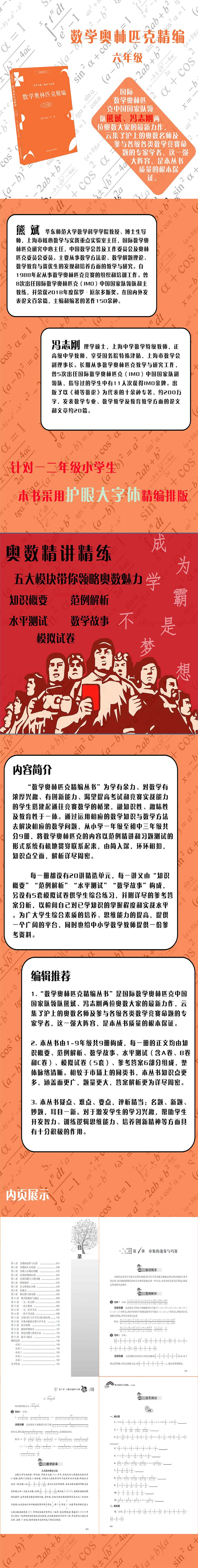 “数学奥林匹克精编丛书”为学有余力、对数学有浓厚兴趣、有创新能力、渴望提高考试和竞赛实战能力的学生搭建起通往竞赛数学的桥梁,融知识性、趣味性及教育性于一体。通过运用相应的数学知识与数学方法去解决相应的数学问题,从小学一年级至初中三年级共分9册,将数学奥林匹克的内容以范例精讲和习题测试的形式系统有机地贯穿联系起来,由简入深,环环相扣,知识点全面,解析详尽周密。每一册都设有20讲精选单元,每一讲又由“知识概要”“范例解析”“水平测试”“数学故事”构成,另设有5套模拟试卷供学生综合练习,并附详尽的参考答案分析,以检阅自己对已学知识的掌握程度和实战水平。为广大学生综合素质的培养、思维能力的提高,提供一个广阔的平台,同时也给中小学数学教师提供一份参考资料。