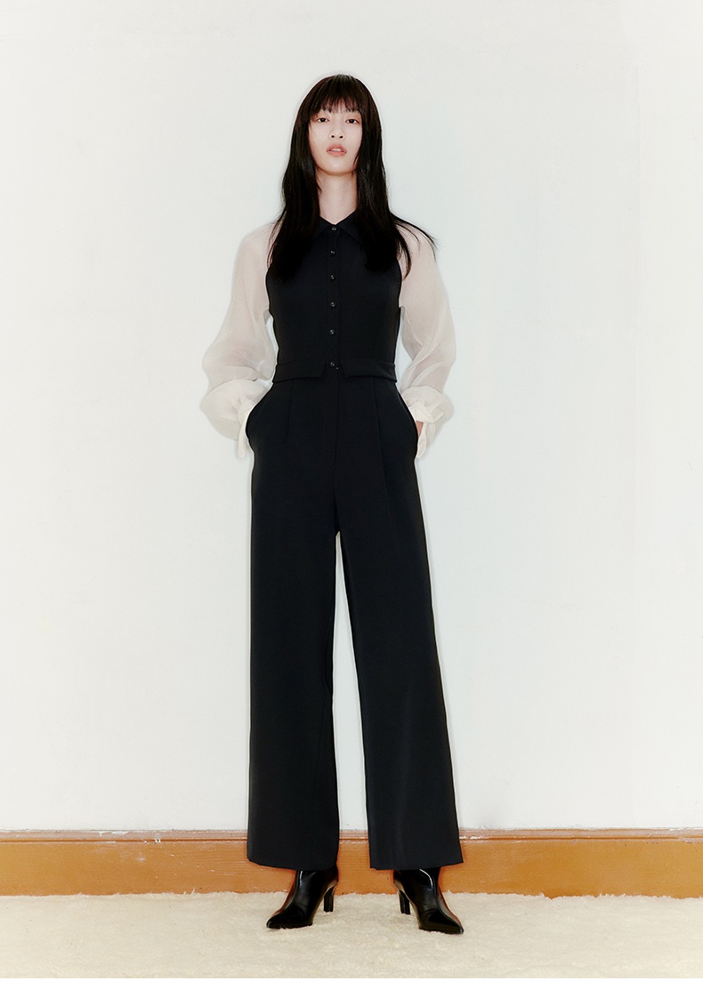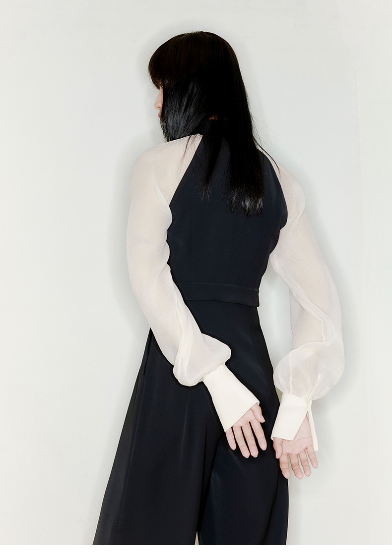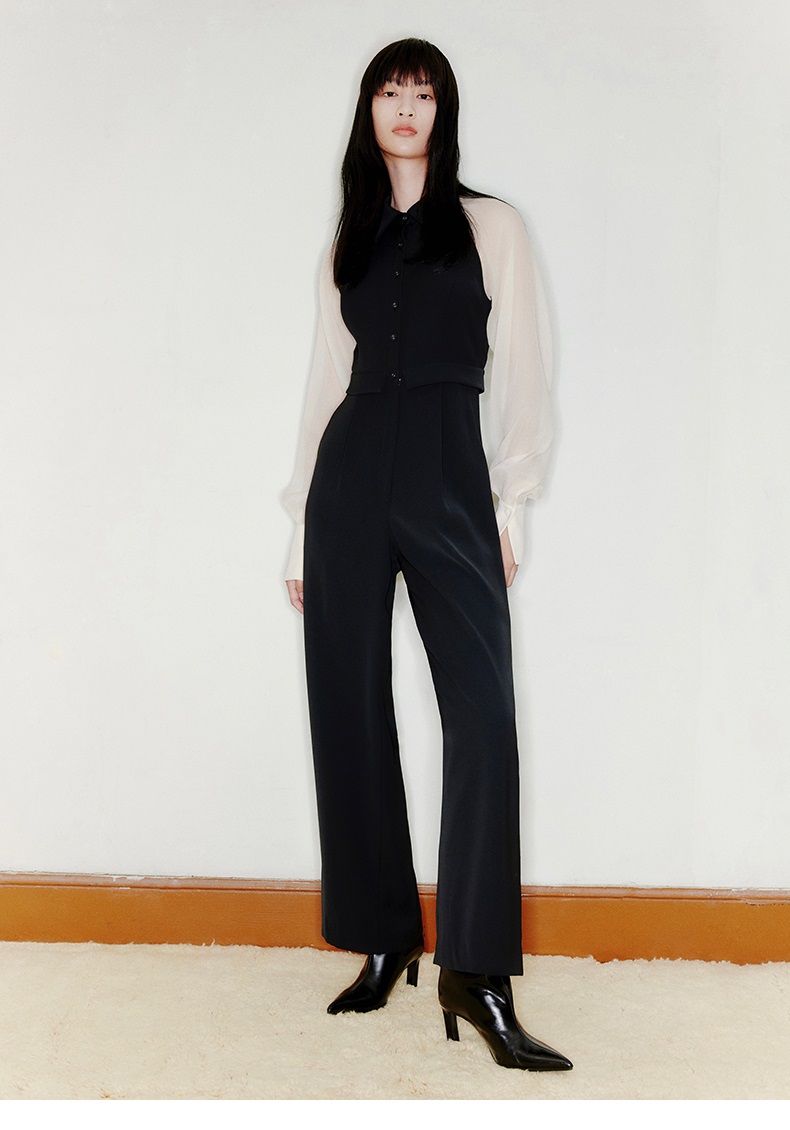 【曙光】削肩薄纱长袖拼色衬衣领高腰连体裤/22000005