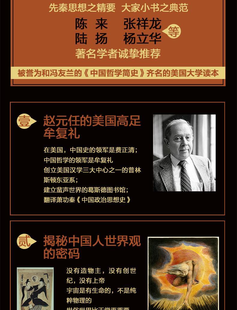 该书是美国流传已久的一本介绍中国早期思想的推荐阅读书,以流畅明晰的笔法、高超的见识和深厚的文化比较的功力,对儒家、道家、墨家、名家、法家的思想和代表人物进行了简明精妙的介绍。同时又以宏观的话题,如宇宙论、世界观、知识论、政治哲学、人性论等贯穿在对这几大学派的的介绍和分析中,既高屋建瓴,又曲尽其妙,是大家小书的典范。