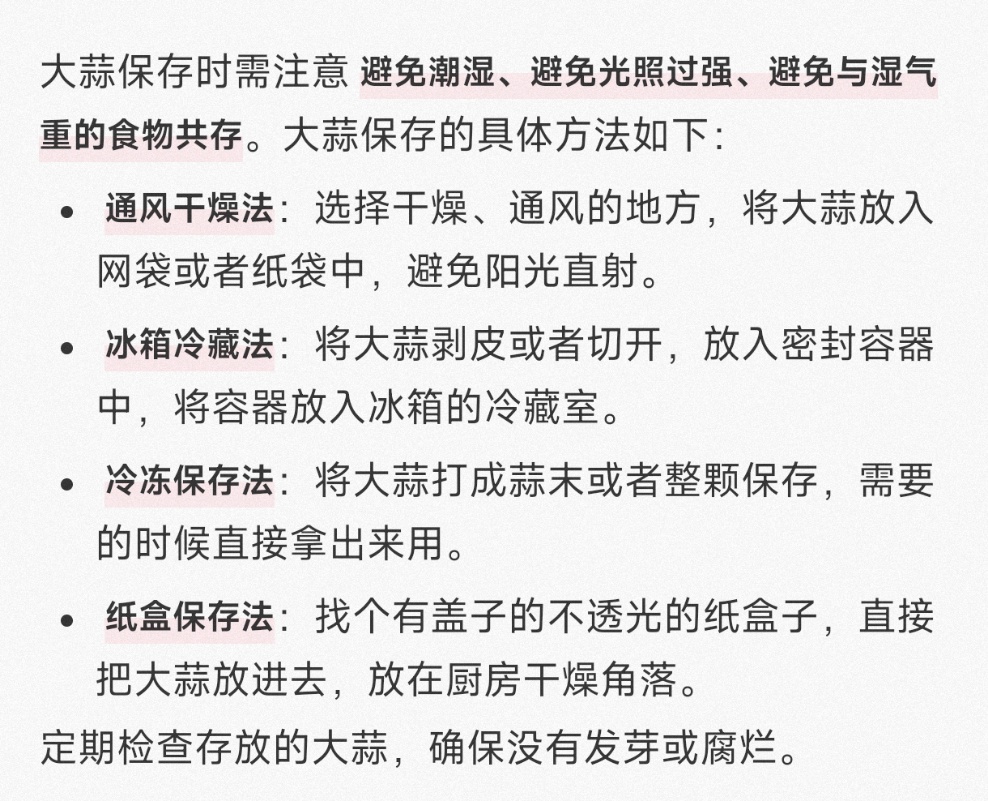 1.直接将收到的大蒜连同包装一起静置在室内通风阴凉处,或放在陶罐里置于阴凉干燥处,不要封口。大蒜不长芽,不长毛,不变干,能保存一个多月;