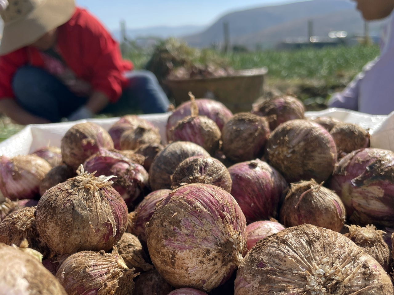 其实在云南,独头蒜、元宝蒜、多瓣蒜都是同一块地里挖出来的。同样的蒜种种植下去以后,如果只有一个胚芽成活,长出的就是独头蒜。2-3个胚芽成活,长出元宝蒜。多个胚芽成活,还能开花张蒜薹的,就是多瓣蒜啦。