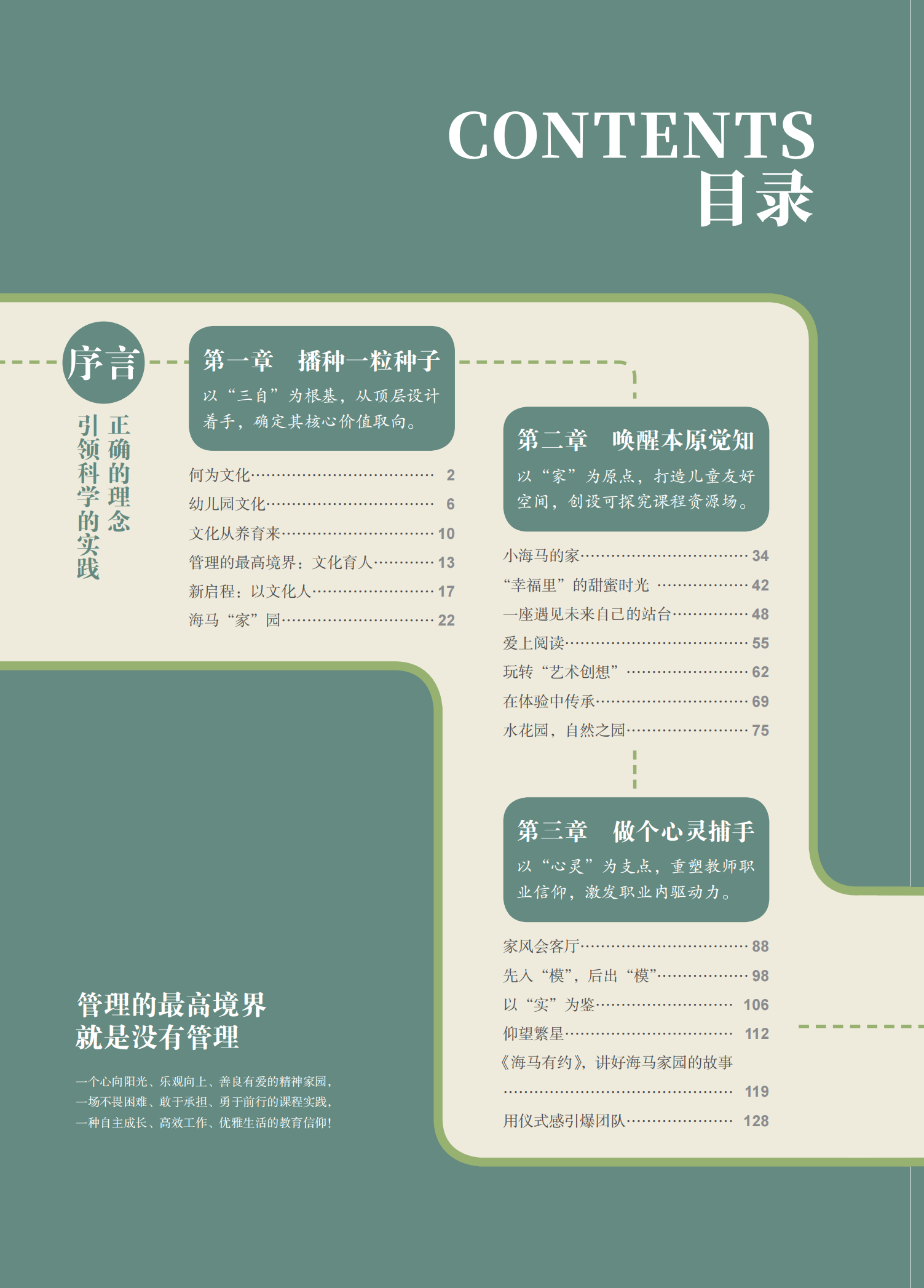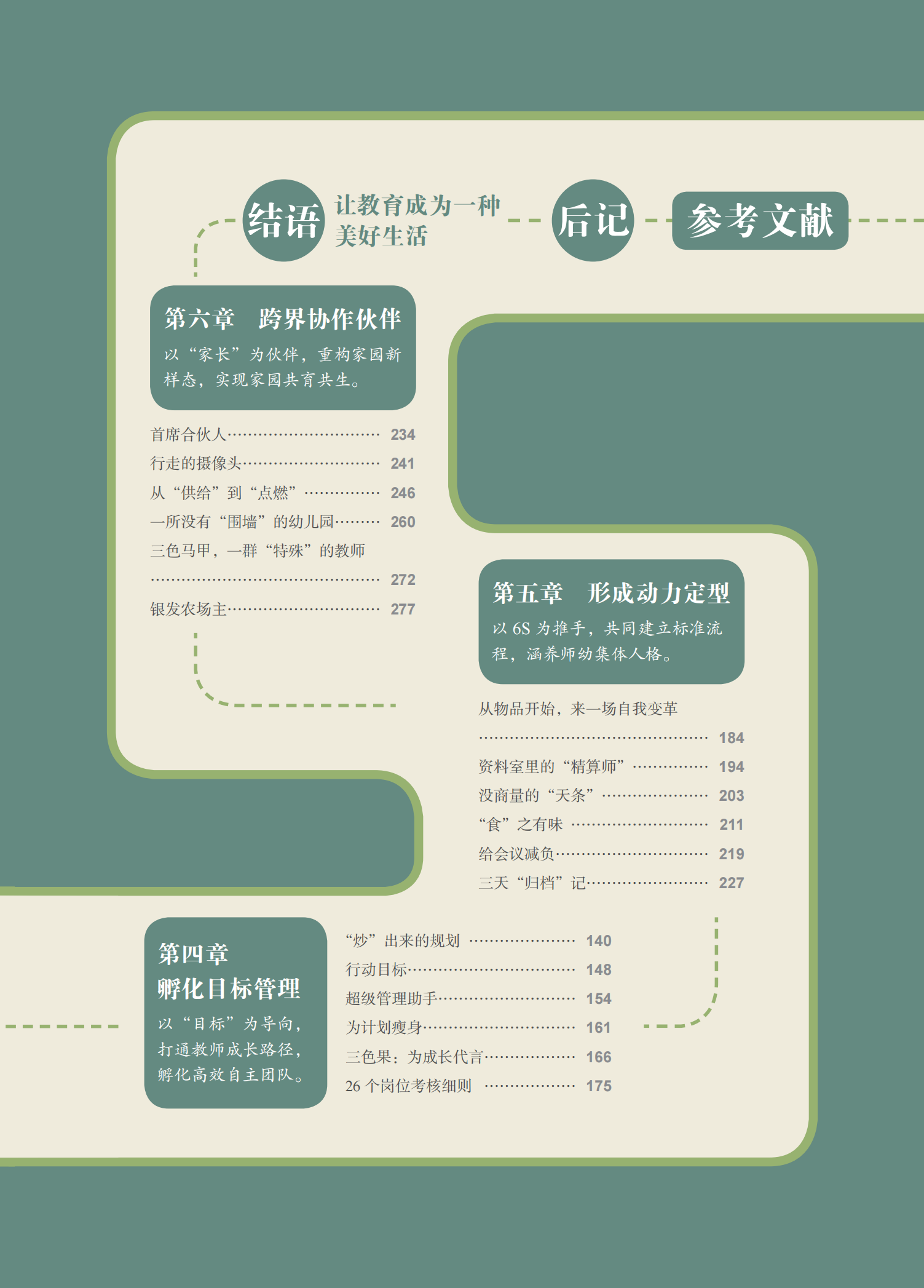 本书是基于作者在幼儿园多年的管理经验梳理而成的。全书共有六个篇章,分别从园本文化体系的构建与诠释、物质环境创设、教师成长支架、目标价值导向、幼儿园6S精细化管理以及家园共育合作等方面,呈现作者在管理上的做法、思考以及成效。通过生动的案例故事和可操作性的内容,带来一份幼儿园“无痕管理”实操指南,解锁“文化”这一现代幼儿园管理密码。