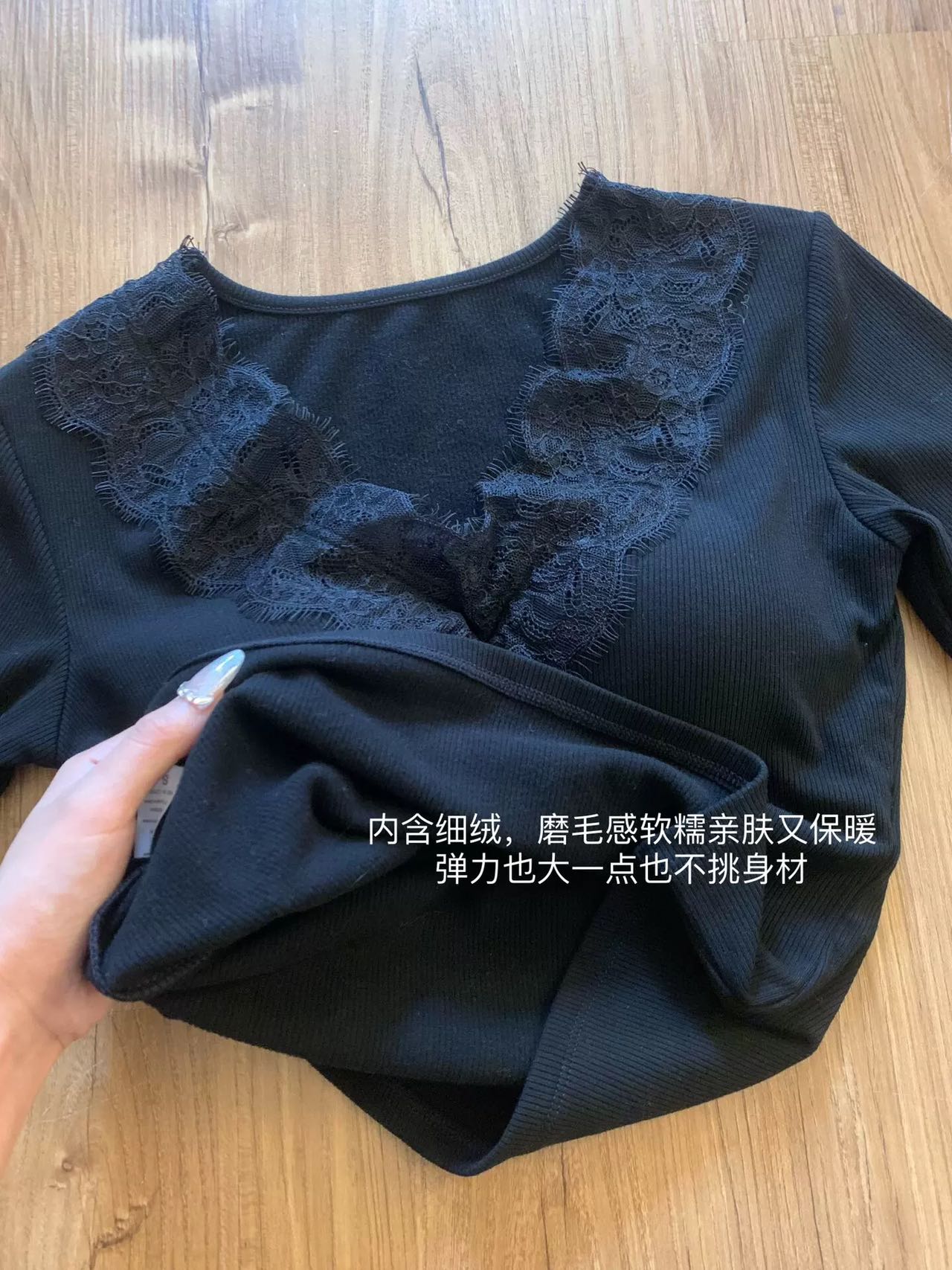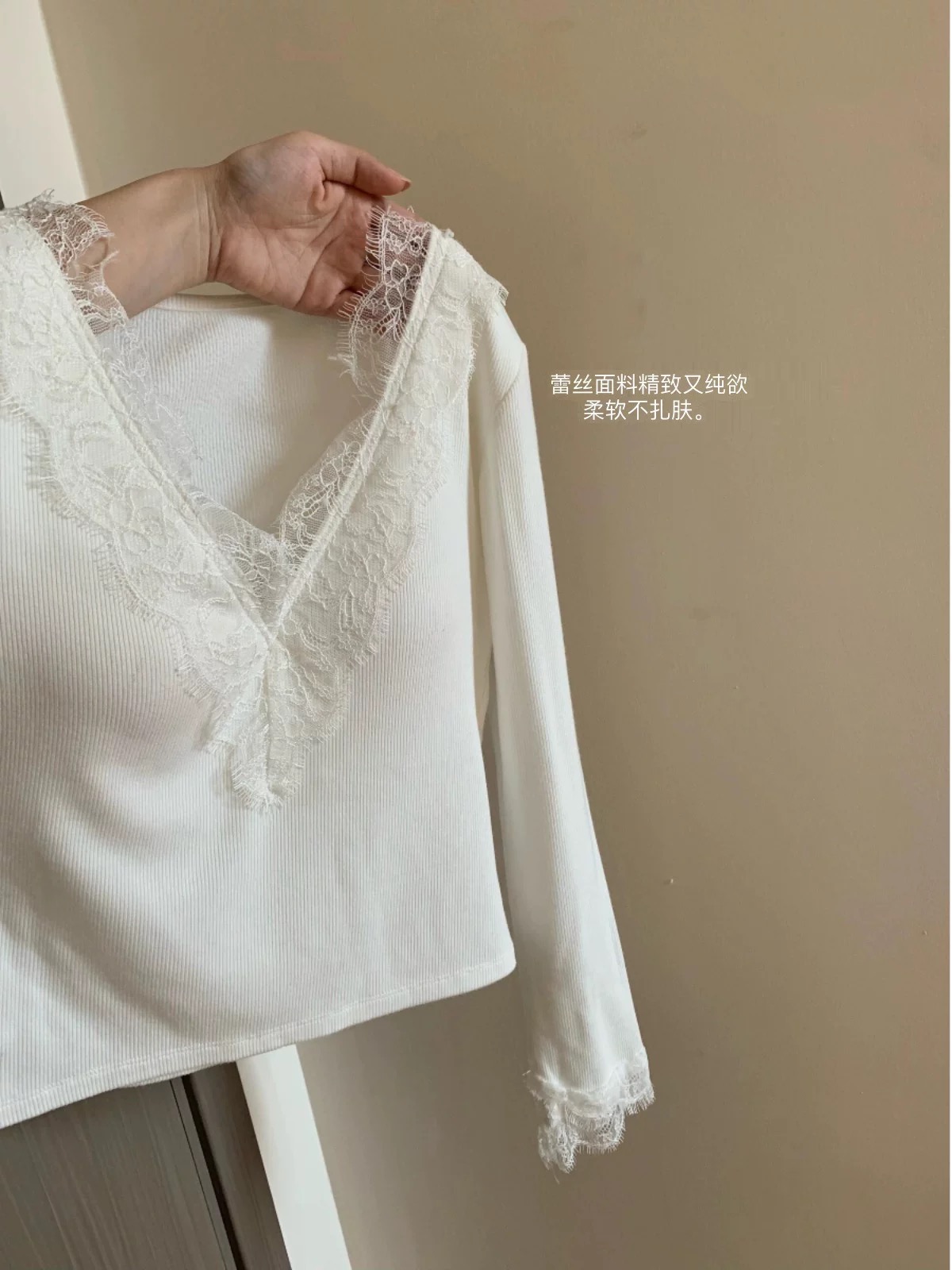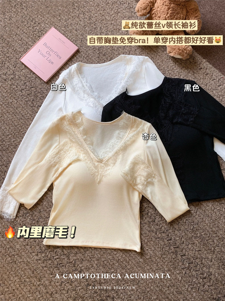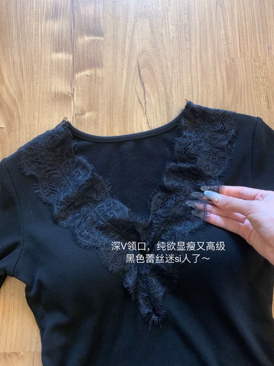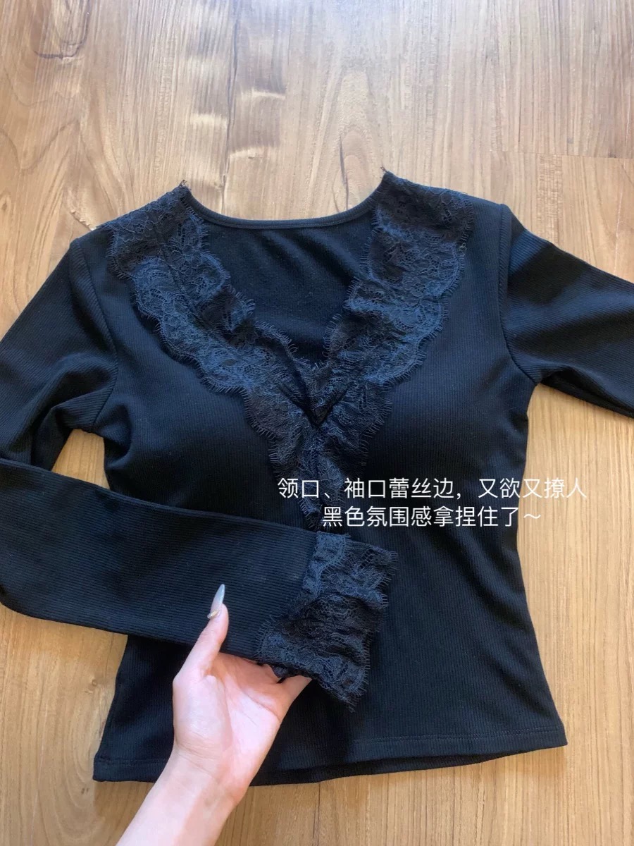 【YW】无忧购多巴胺V领蕾丝内搭打底衫女纯欲氛围感长袖上衣1206(截单后7天发货)