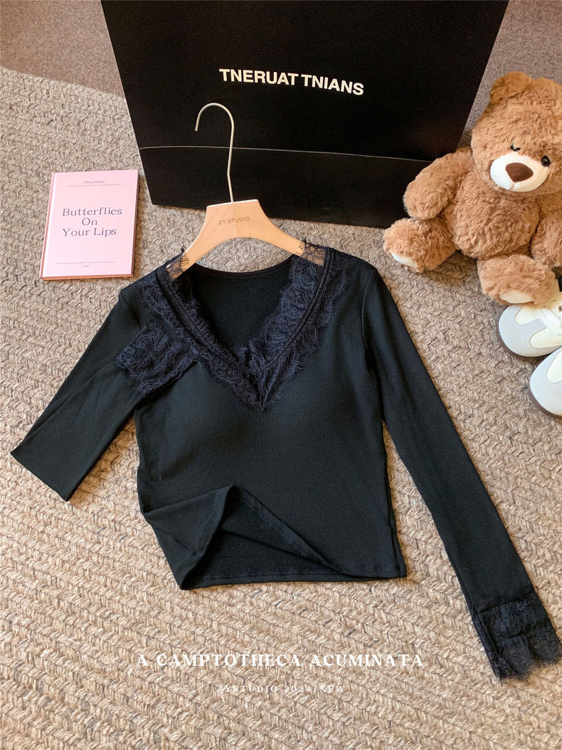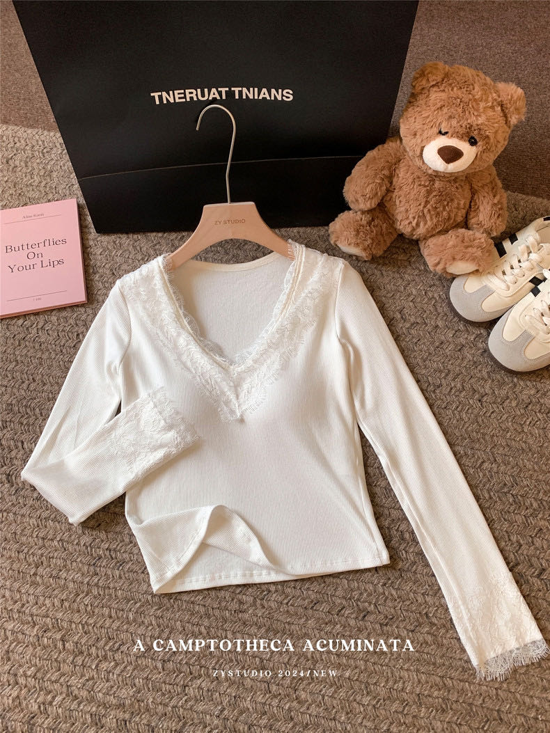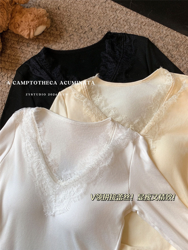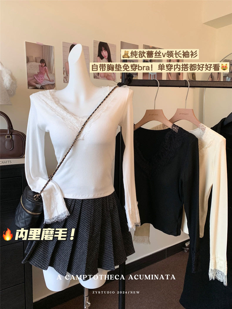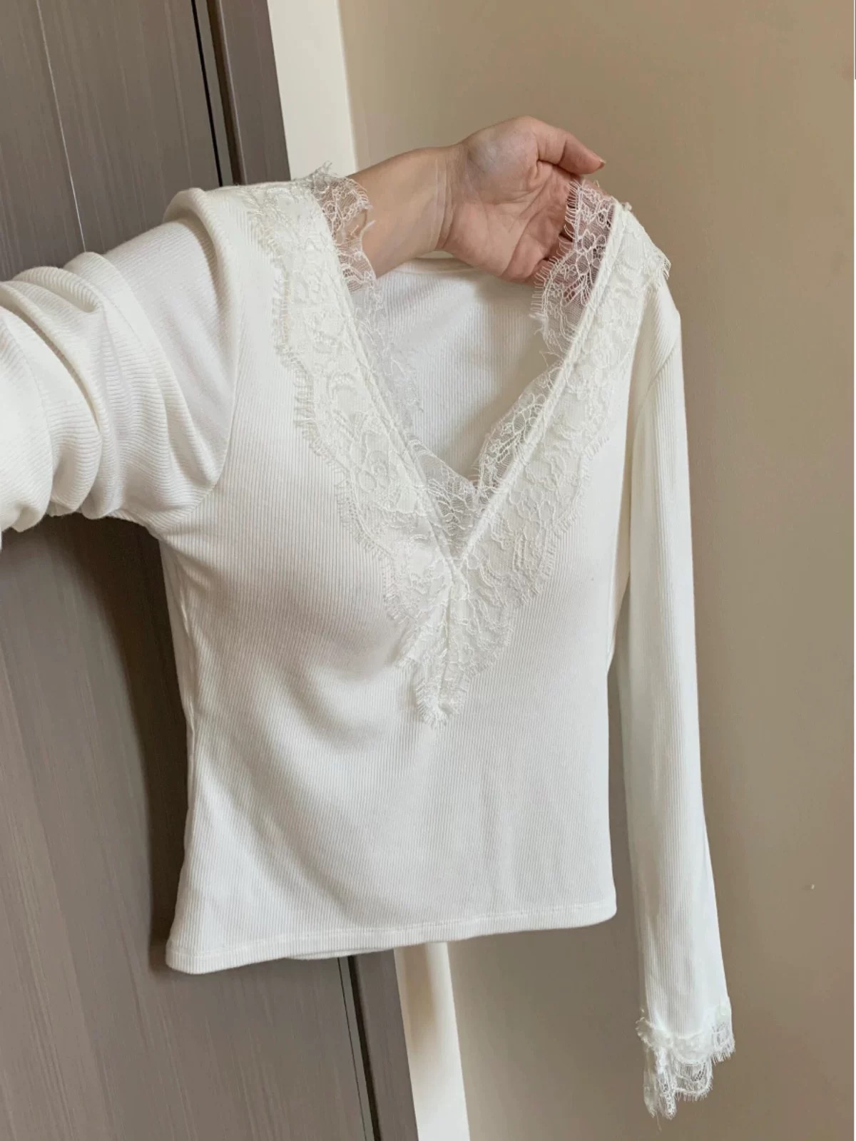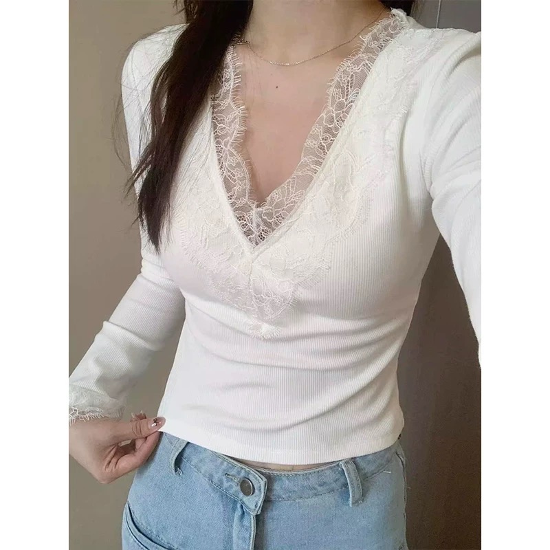 【YW】无忧购多巴胺V领蕾丝内搭打底衫女纯欲氛围感长袖上衣1206(截单后7天发货)