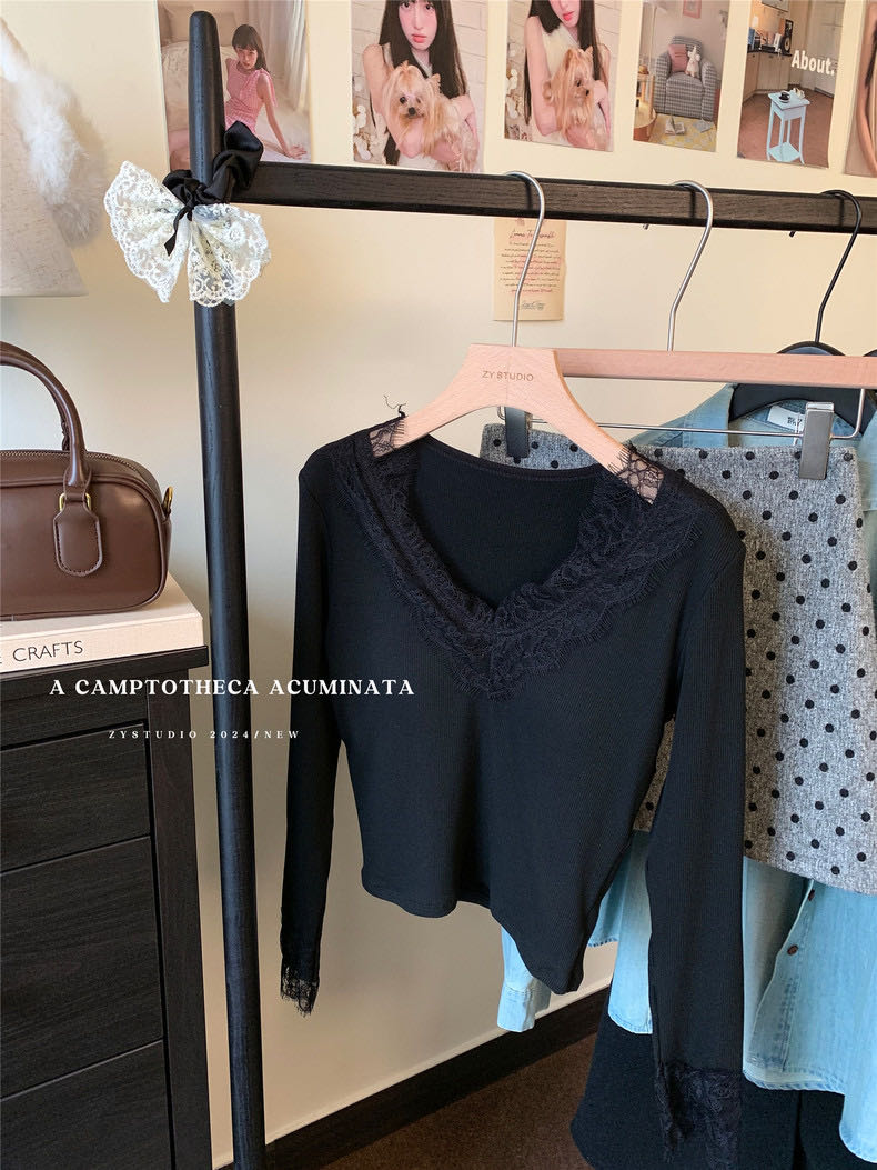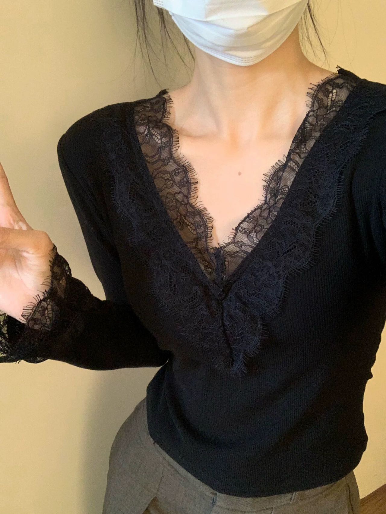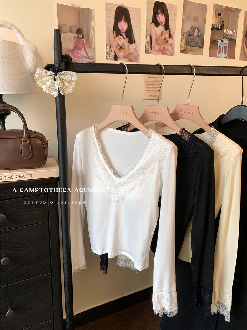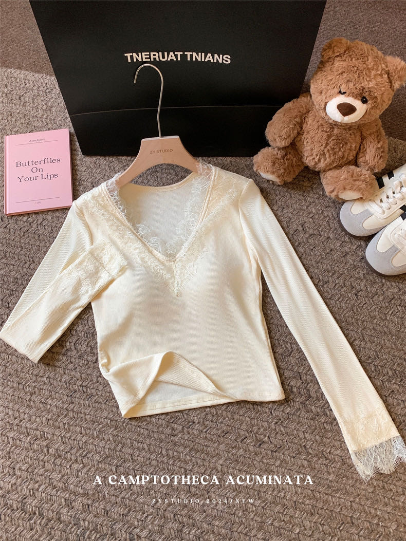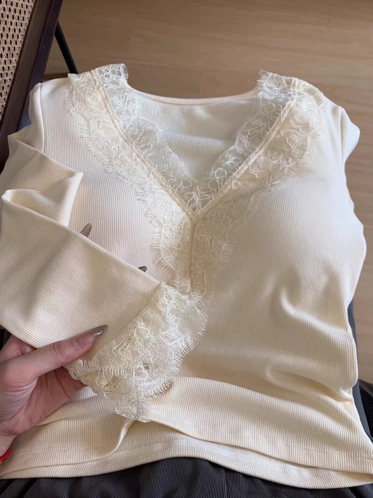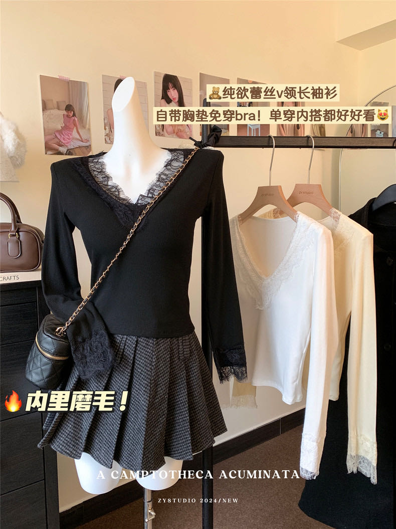 【YW】无忧购多巴胺V领蕾丝内搭打底衫女纯欲氛围感长袖上衣1206(截单后7天发货)