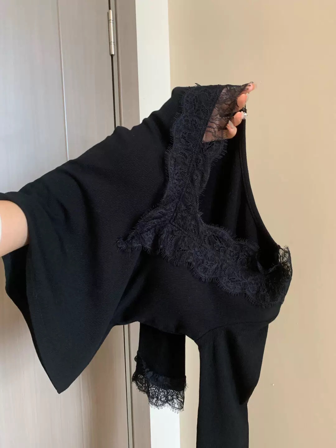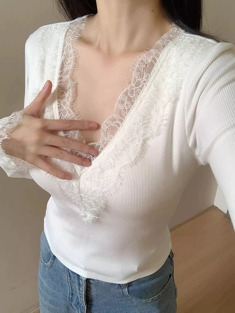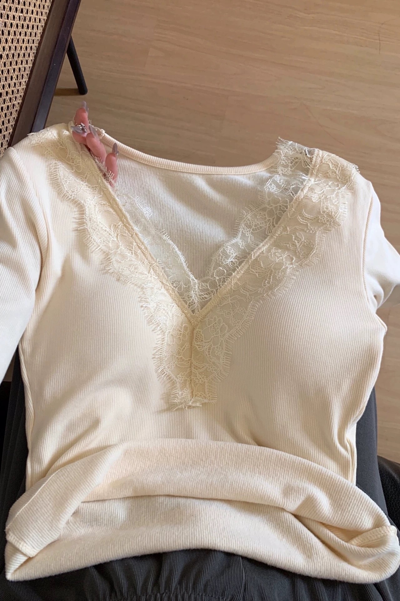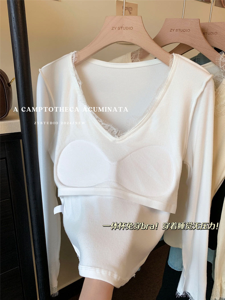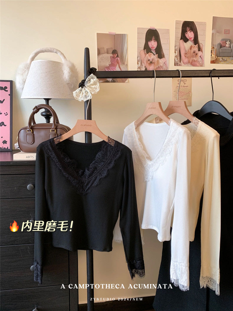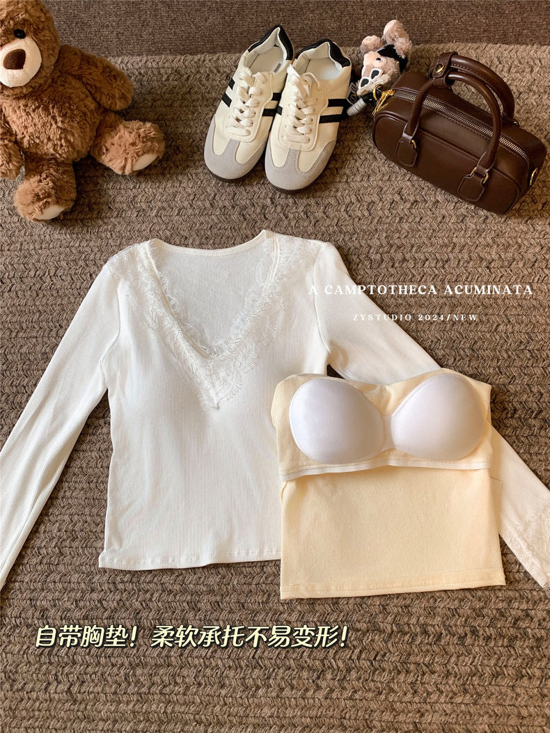 【YW】无忧购多巴胺V领蕾丝内搭打底衫女纯欲氛围感长袖上衣1206(截单后7天发货)