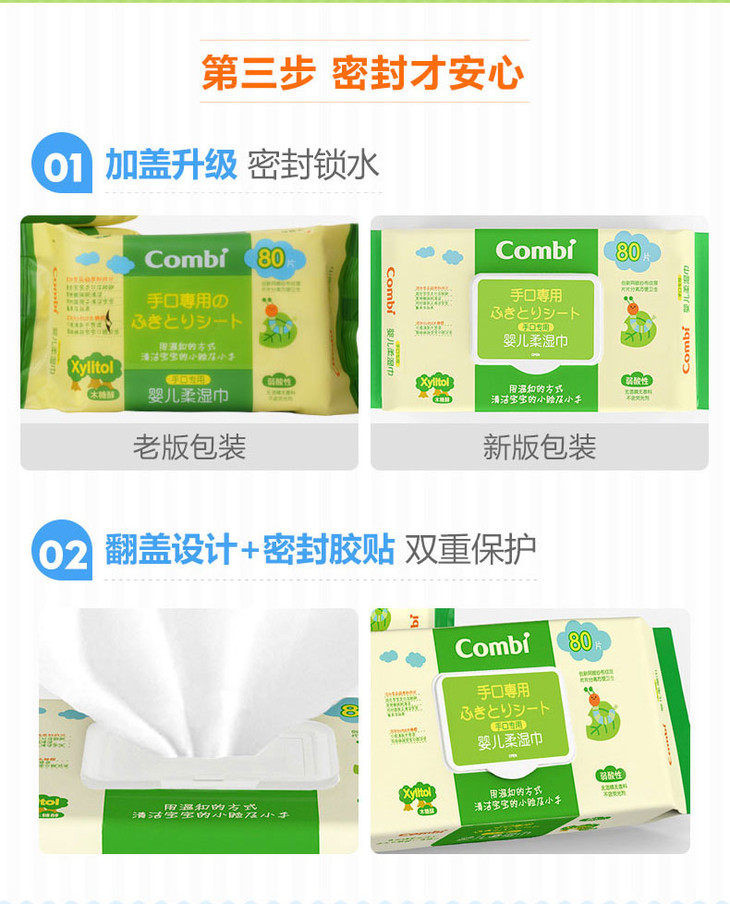 Combi康贝婴儿手口湿巾儿童柔湿巾纸宝宝湿纸巾80抽 *3包婴儿湿纸巾