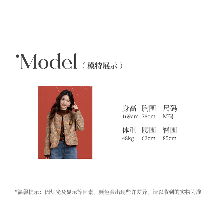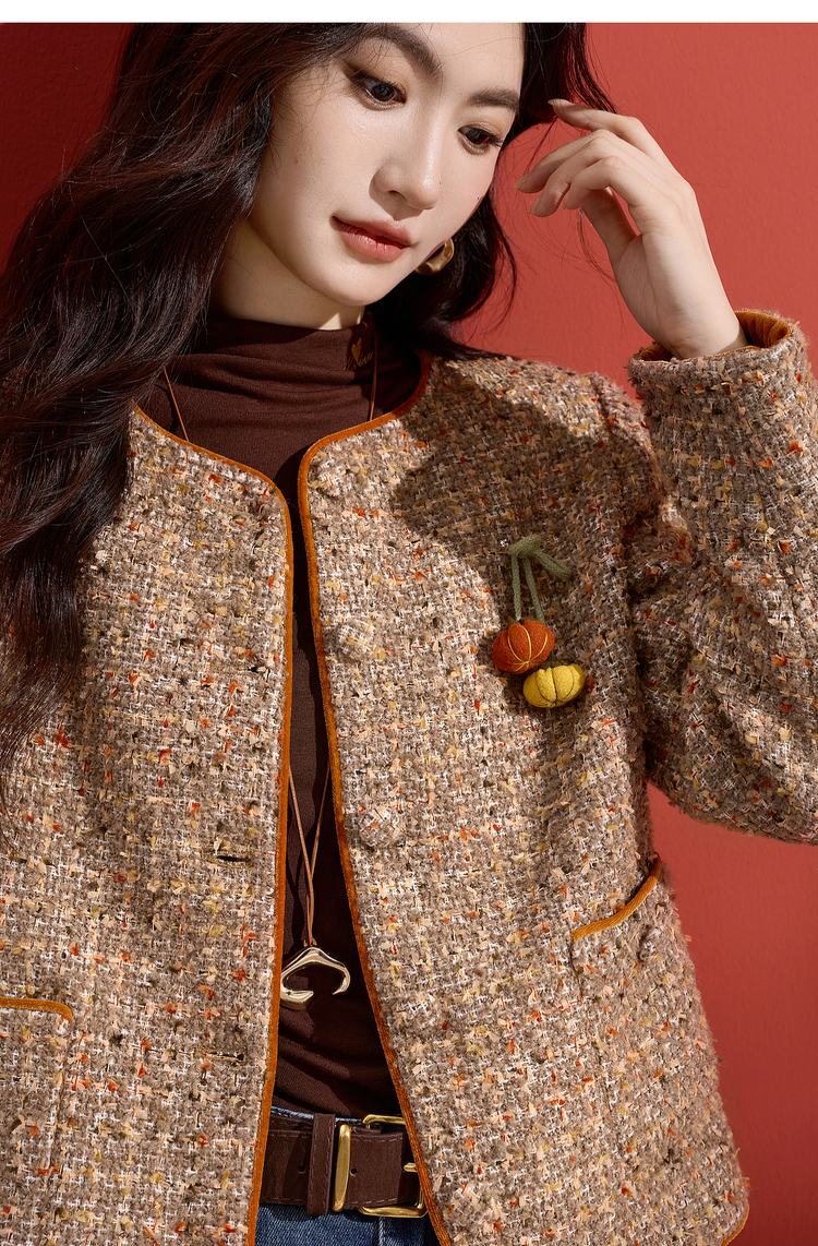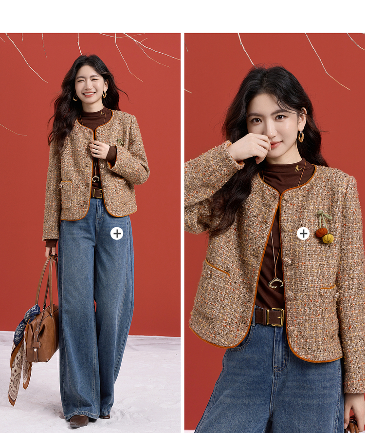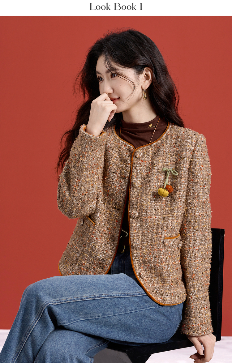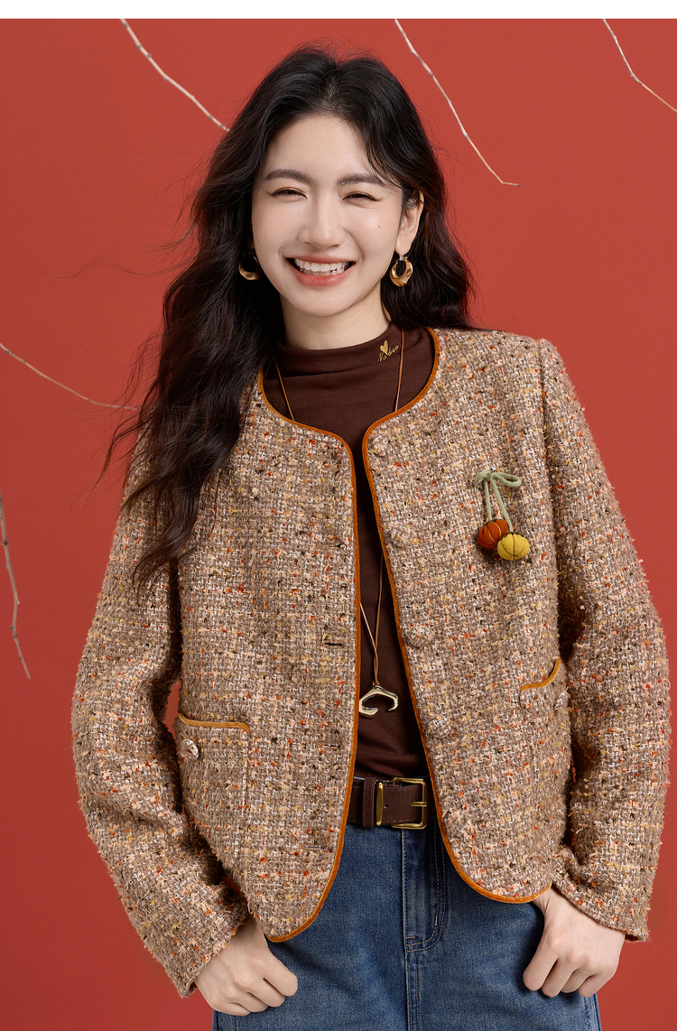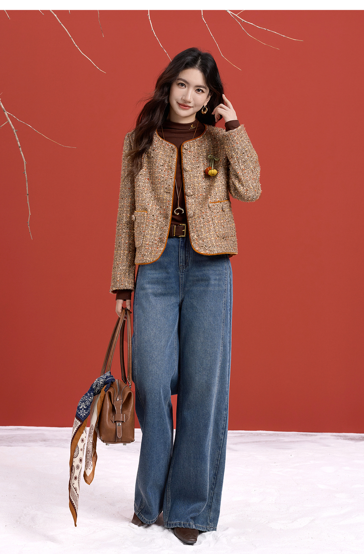 【12/10新品6折】熙世界小香风羊毛粗花呢短外套女秋冬厚款高级感气质圆领开衫上衣
