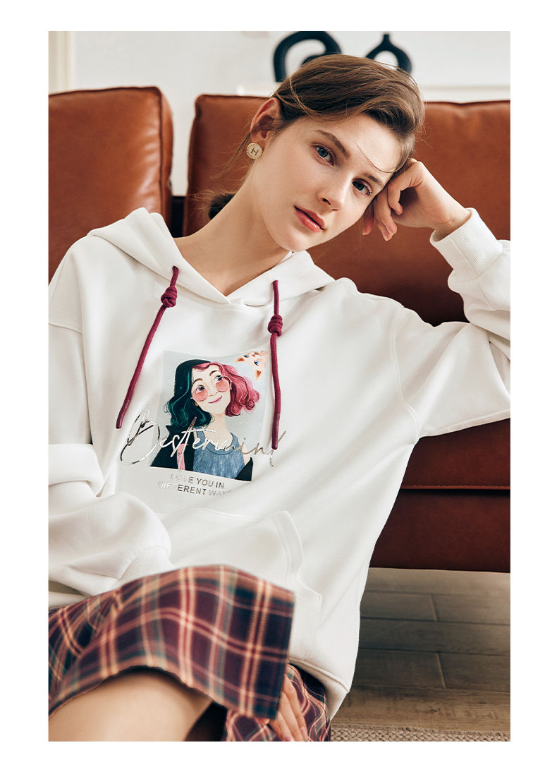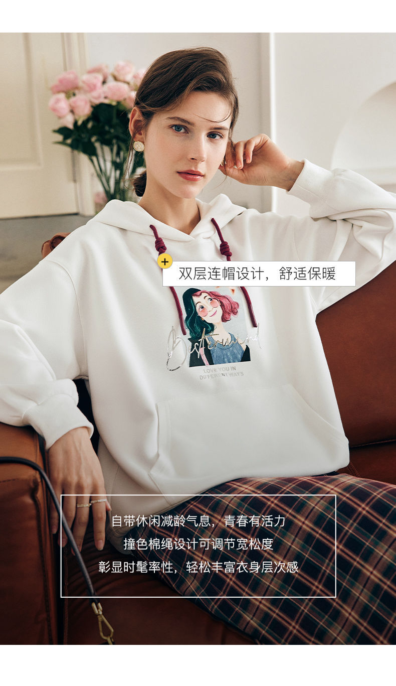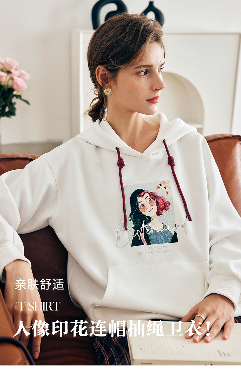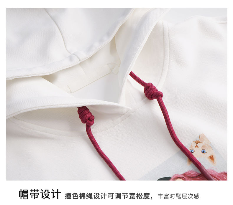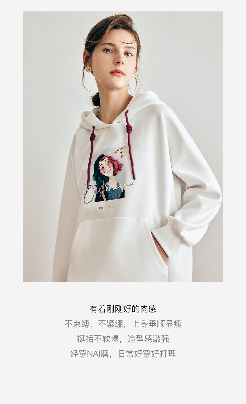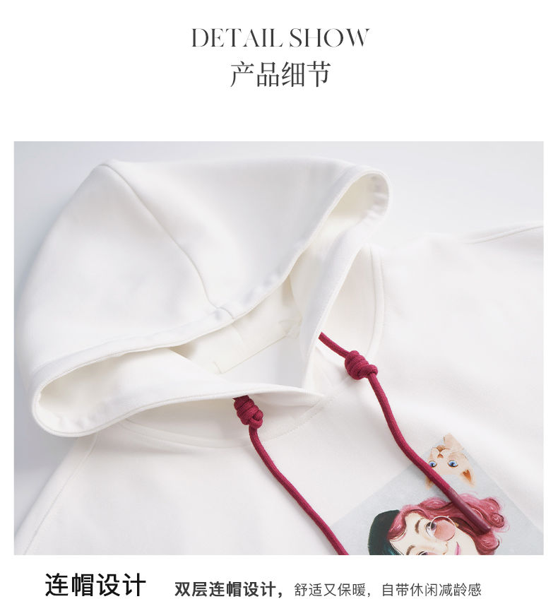 OLrain欧芮儿法式白色连帽卫衣女早春2023年新款宽松慵懒印花上衣