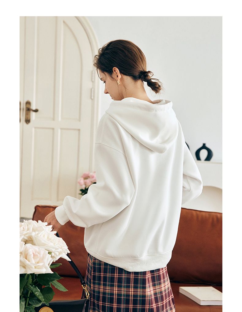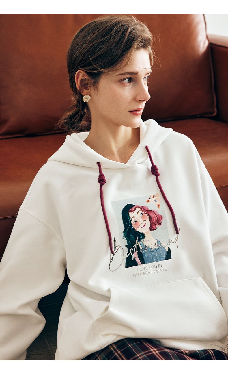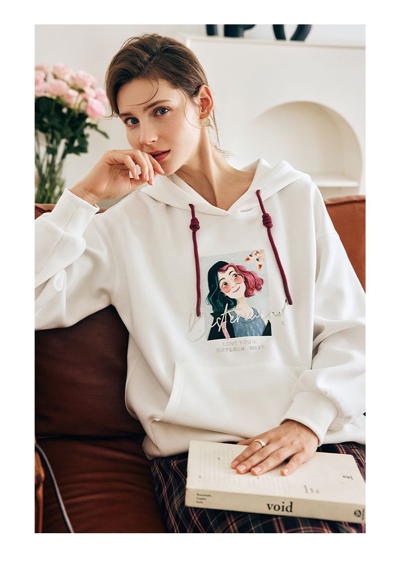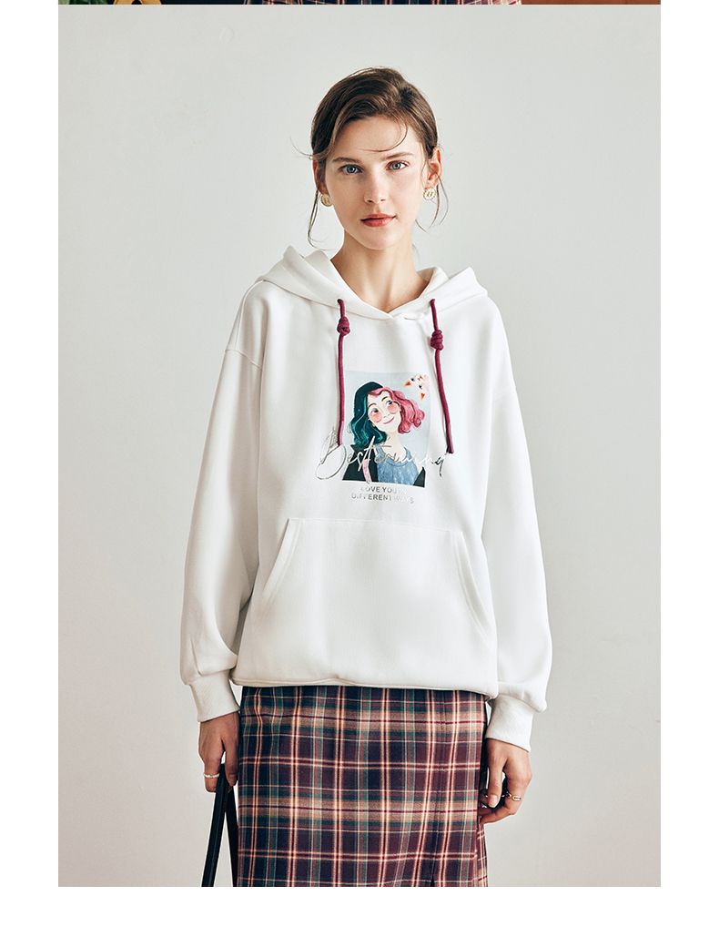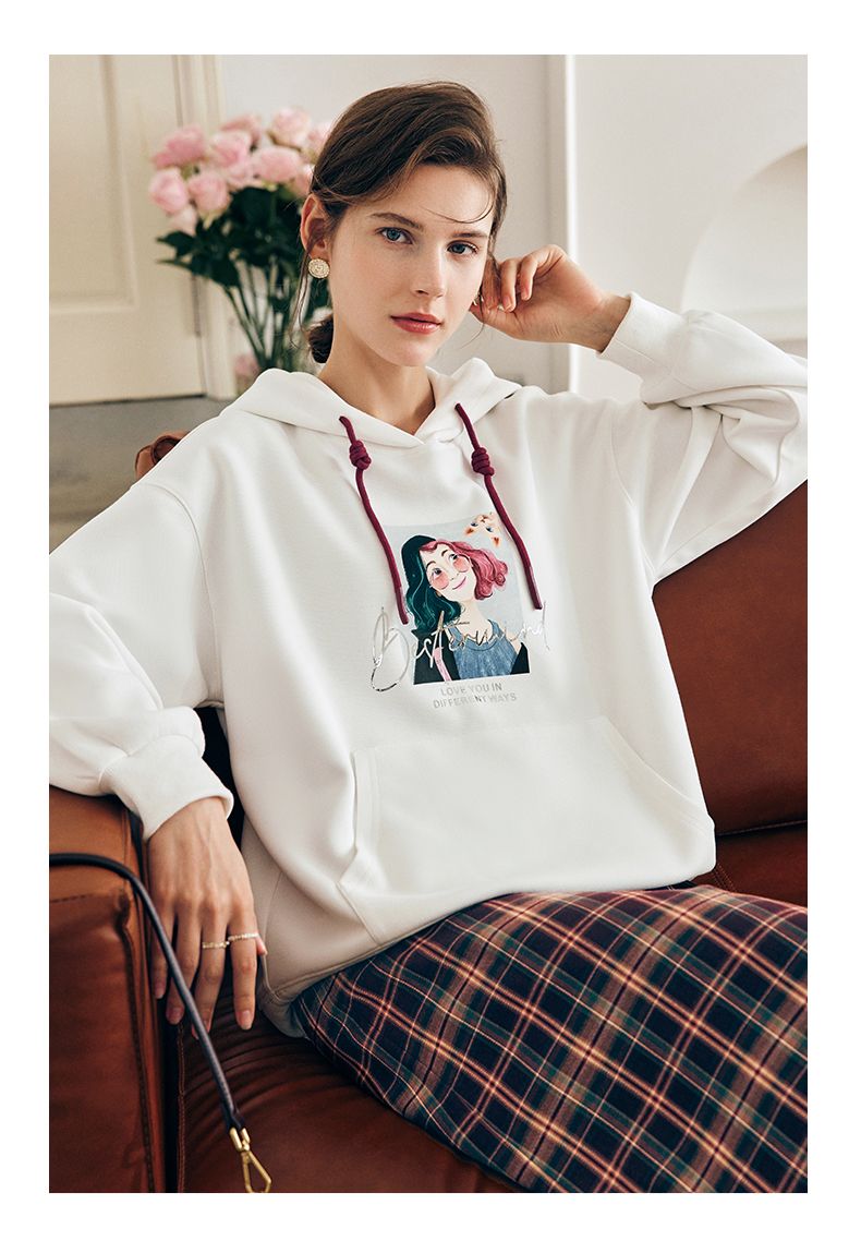 OLrain欧芮儿法式白色连帽卫衣女早春2023年新款宽松慵懒印花上衣