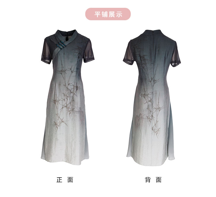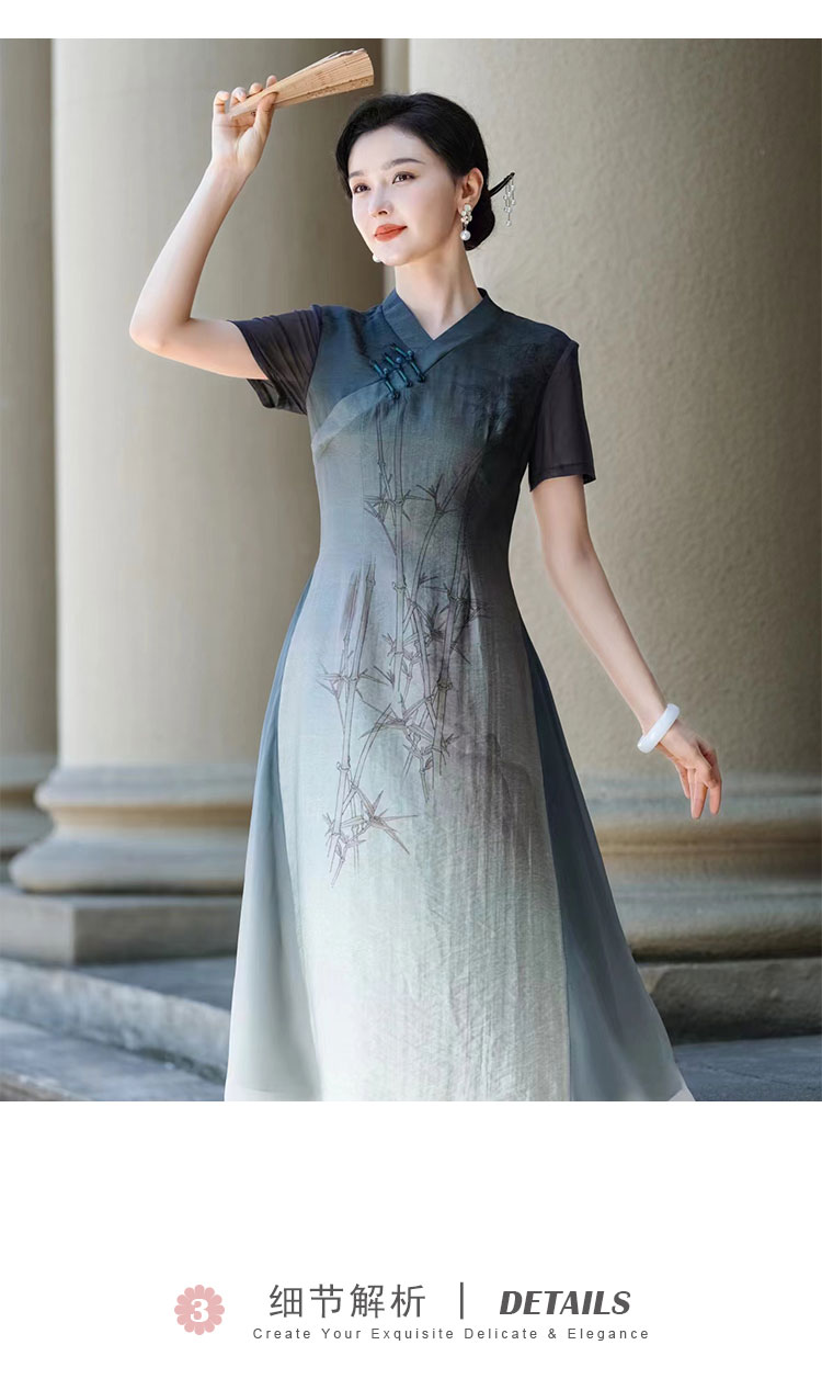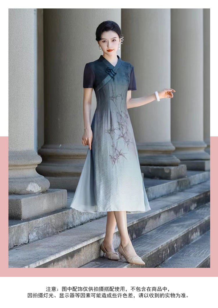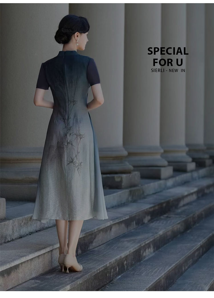 PG802斯尔丽24新款改良渐变水墨画国风插片网布袖高腰节放摆连衣裙