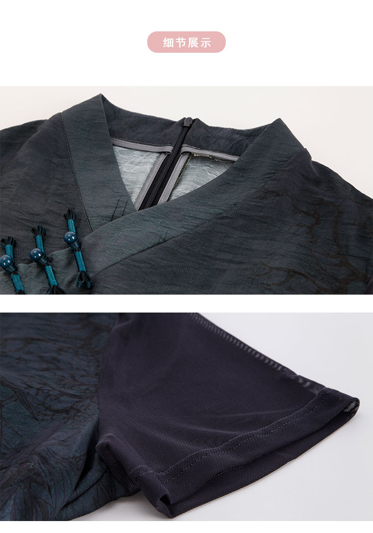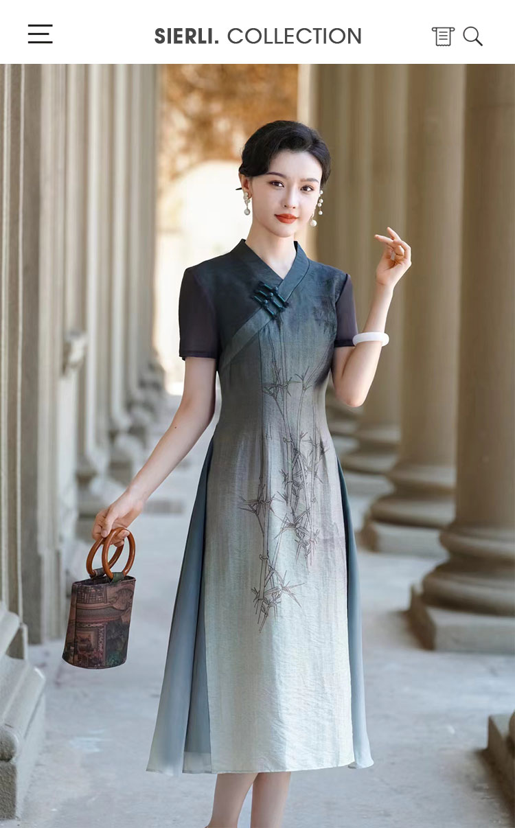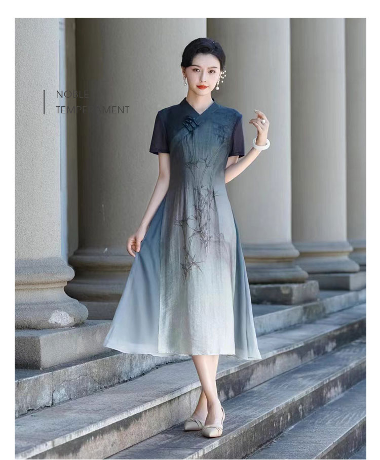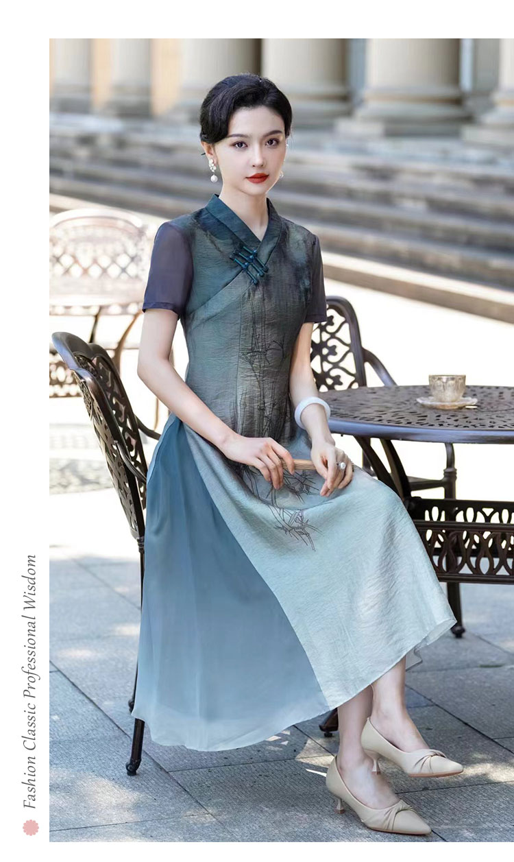 PG802斯尔丽24新款改良渐变水墨画国风插片网布袖高腰节放摆连衣裙
