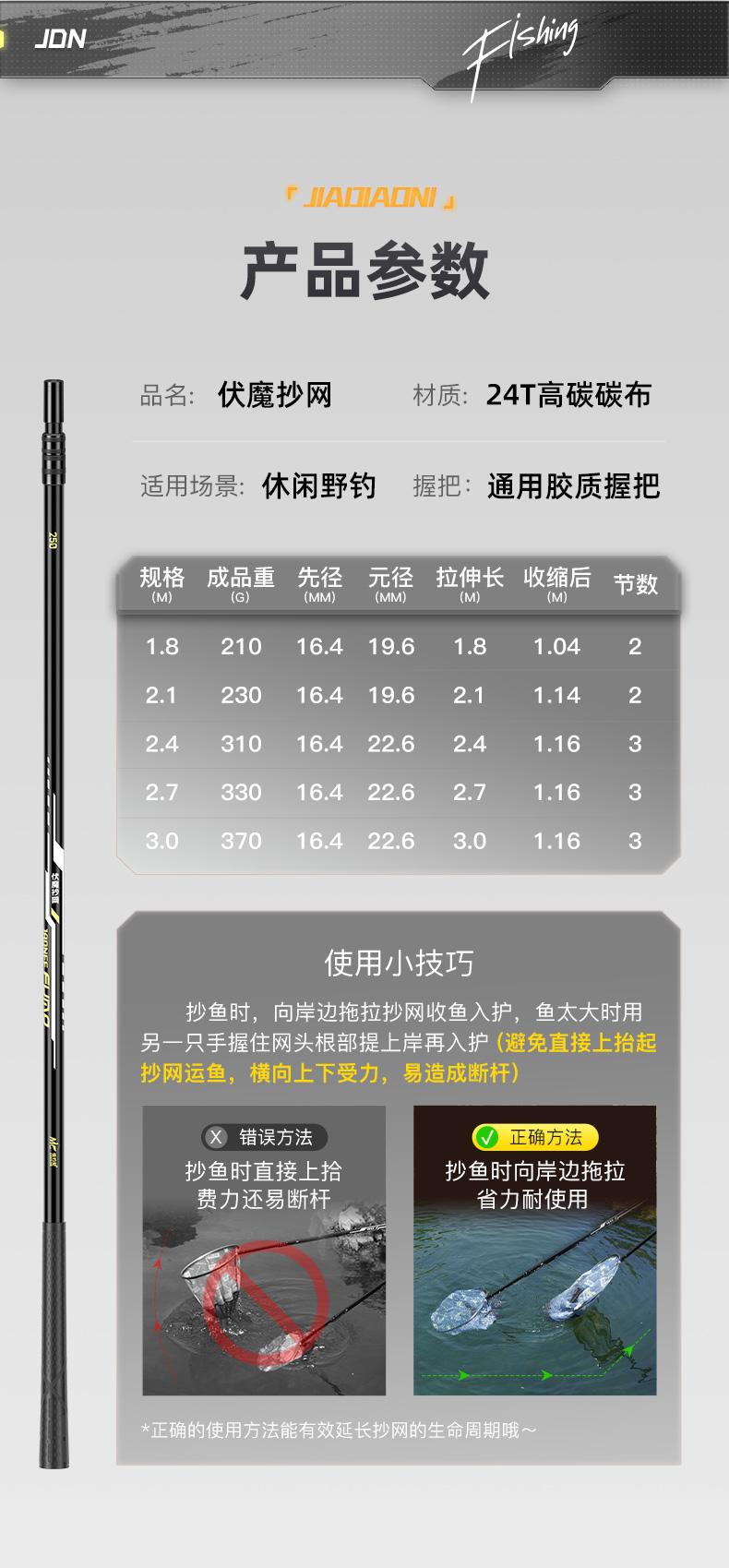 佳钓尼伏魔抄网全套抄网竿碳素超轻硬网头可伸缩杆抄网杆钓鱼用具