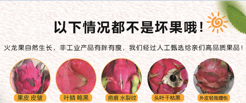 因为我们的火龙果生长在热带高山农场,阳光充足,充足的日照与自然的洗礼,会使得部分果子表皮干枯,褶皱,疤痕,黑板和水裂纹等现象