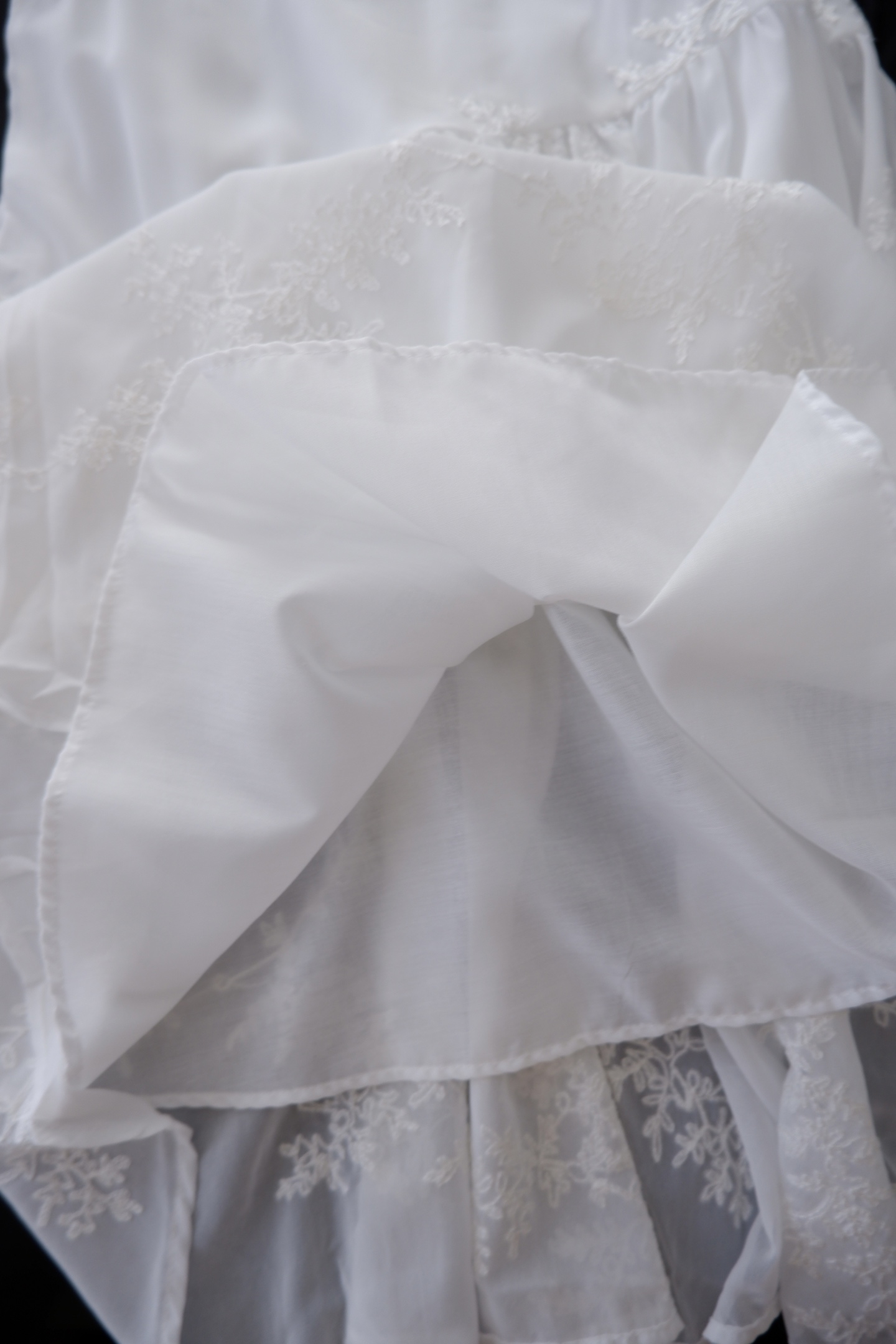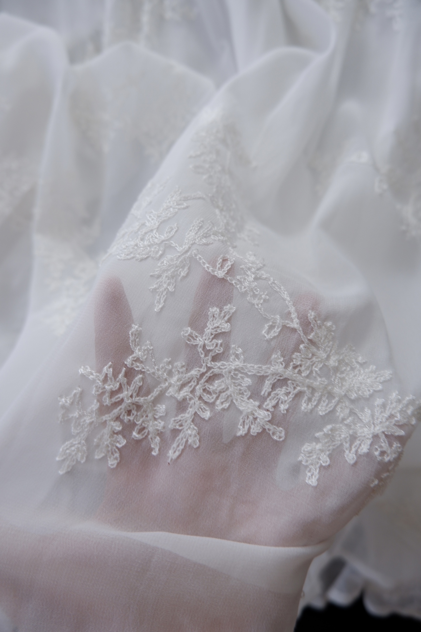 白色雪纺连衣裙, 加上上面做了暗纹绣花 ,上身自带柔光滤镜~