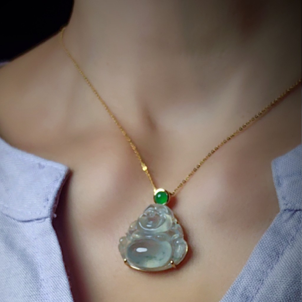 当金链衬着冰透的玉色,反而让弥勒佛的饱满形态更突出。无需过多装饰,却把“大气端庄”四个字焊在了这件小精品上,日常戴不浮夸,重要场合又能镇住场。