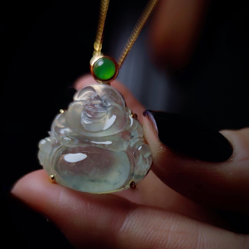 设计初心就是突出翡翠的材质,营造少即是多的高级感。没有繁复的花纹缠绕,没有多余的宝石堆砌,仅用18K金细细勾勒出佛公的轮廓,只在佛公顶部嵌一颗阳绿蛋面当“点睛之笔”如晨星点缀,那是不愿惊扰了翡翠本身的灵韵。
