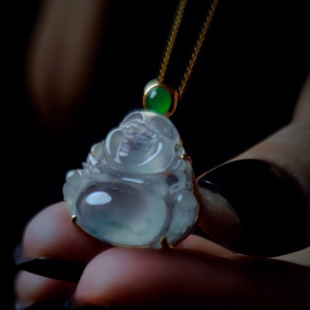 高冰种的通透度,让翡翠多了份独特的“光感”,仿佛是掬一捧春日清泉凝在掌心,圆滚滚的肚子,冰荧底色上,两抹淡淡的飘蓝花悄然晕染,恰似中国水墨写意,让人浮想,身处洱海苍山之间,悠然泛舟湖上,山水灵韵尽融于此。