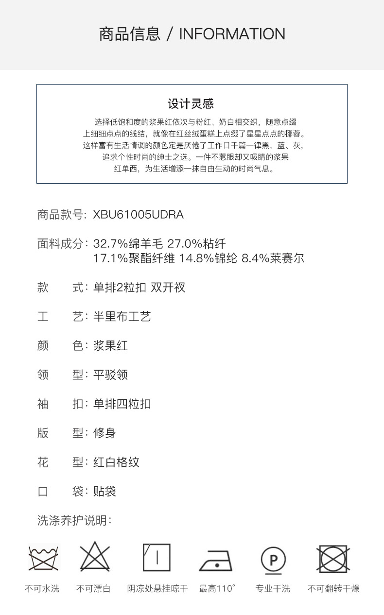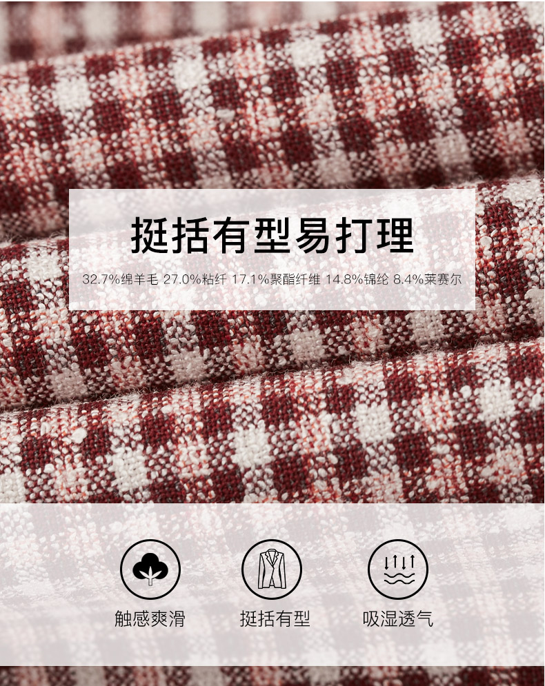 成分:;面料:32.7%绵羊毛 27.0%粘纤;17.1%聚酯纤维 14.8%锦纶;8.4%莱赛尔;