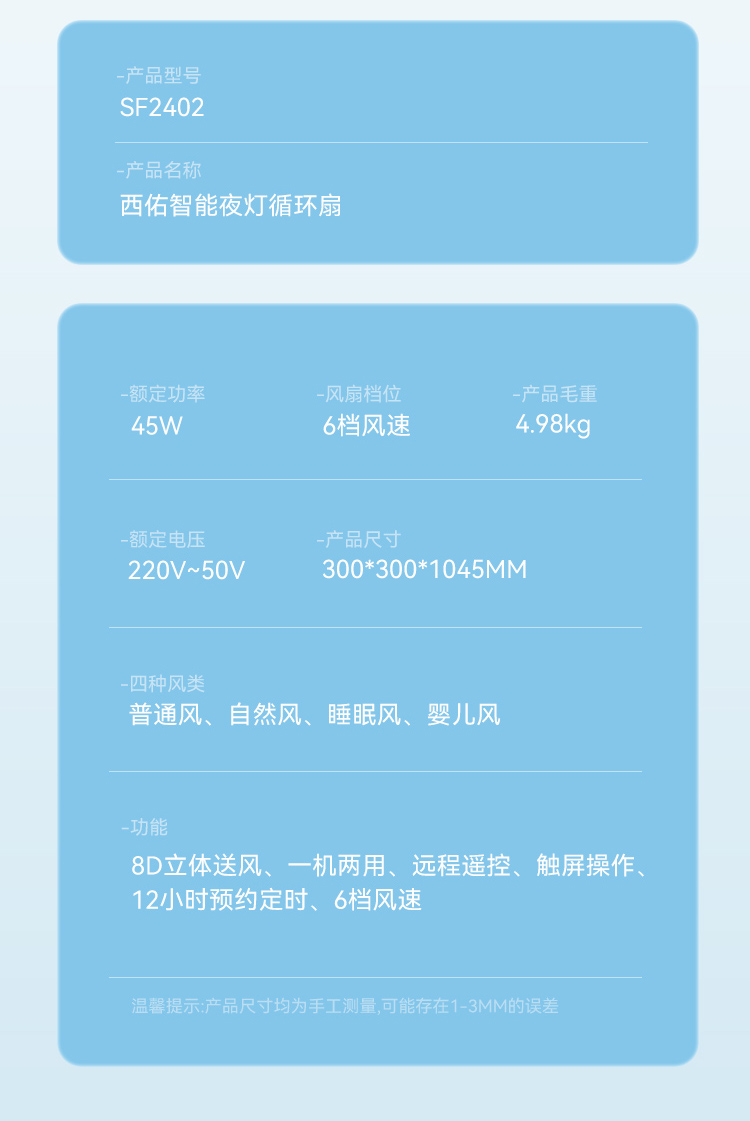 西佑八字摇头空气循环扇风扇落地扇遥控夜灯SF2402【G】