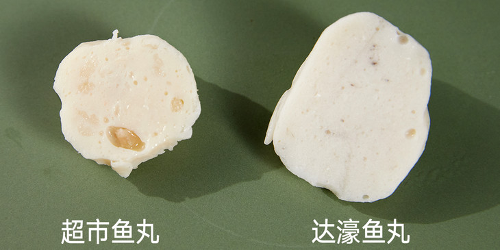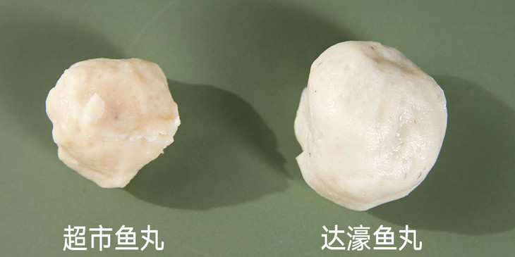 留心对比就会发现,达濠鱼丸煮好后,光是个头就比超市鱼丸大了一圈。