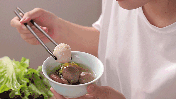 鱼丸的肉质呈现紧致的脆度,咬一口,仿佛在跟牙齿较劲。口感Q弹爽脆,尝到淡淡的海水咸鲜,光是原味就已经足够好吃了!