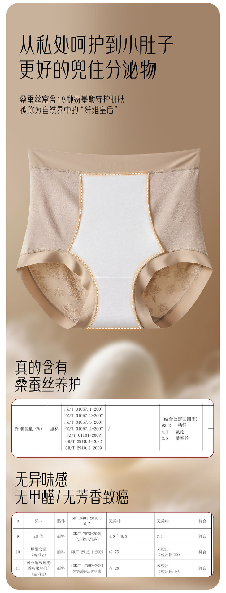 🔺底裆采用桑蚕丝混纺面料、透气清爽不闷热! 达到10A级抑菌效果,有效抑菌(金黄色葡萄球菌99%,大肠杆菌97%,白色念珠菌85%) 富含18种氨基酸和蛋白质,抗菌的同时还能养肤!