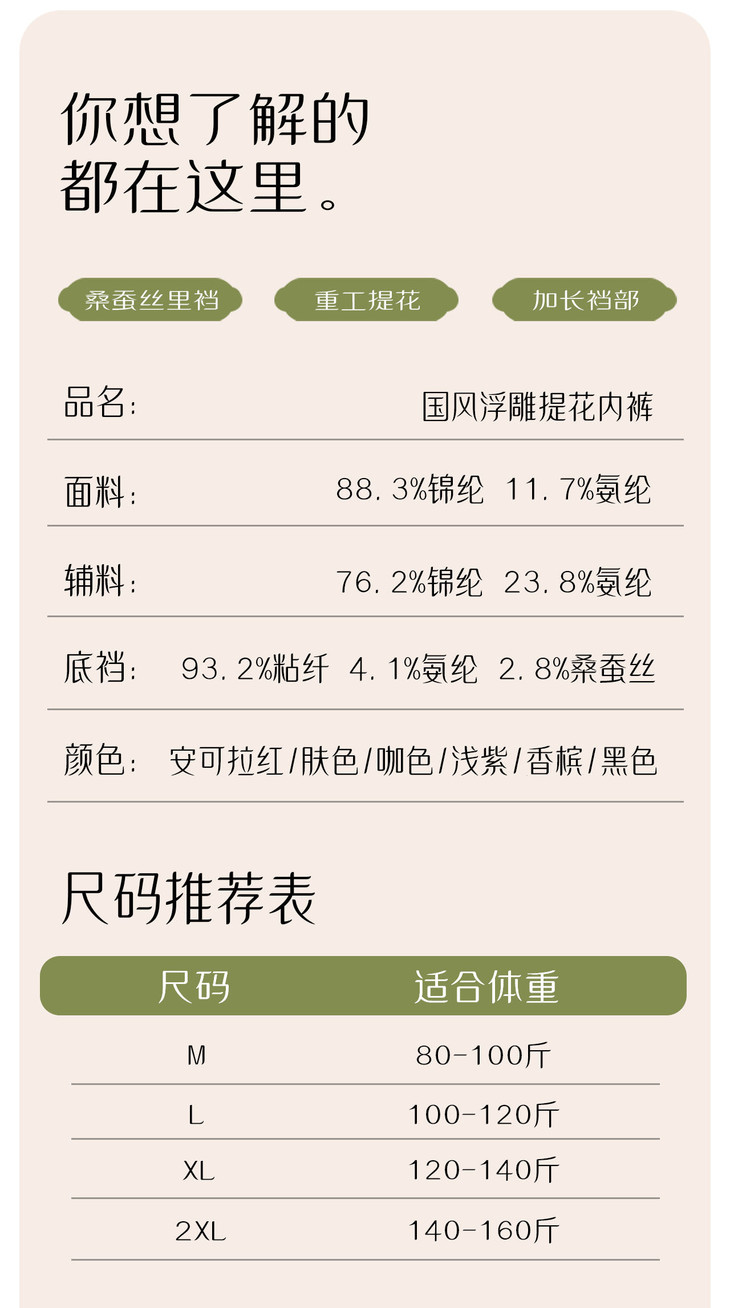 🔺内里蚕丝加宽加长底裆设计,从私处呵护到小肚子,能更好的兜住分泌物,减少摩擦感!