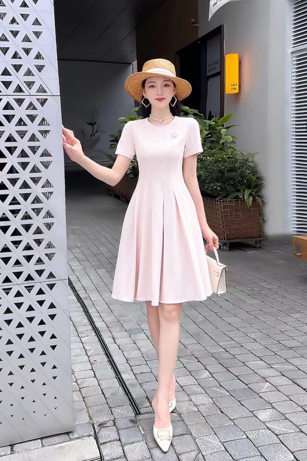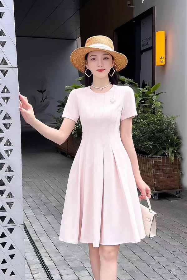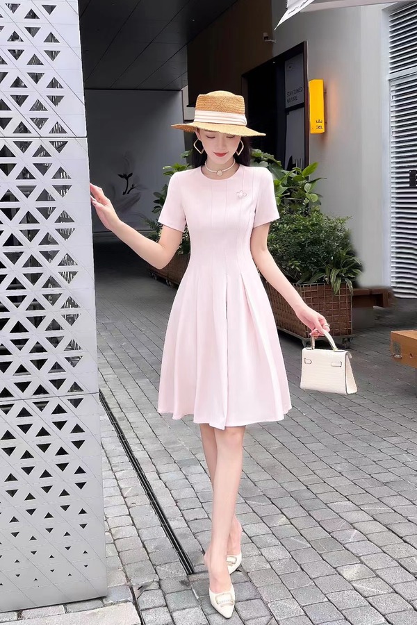 Le Malene 气质简约粉色百褶收腰连衣裙 18337