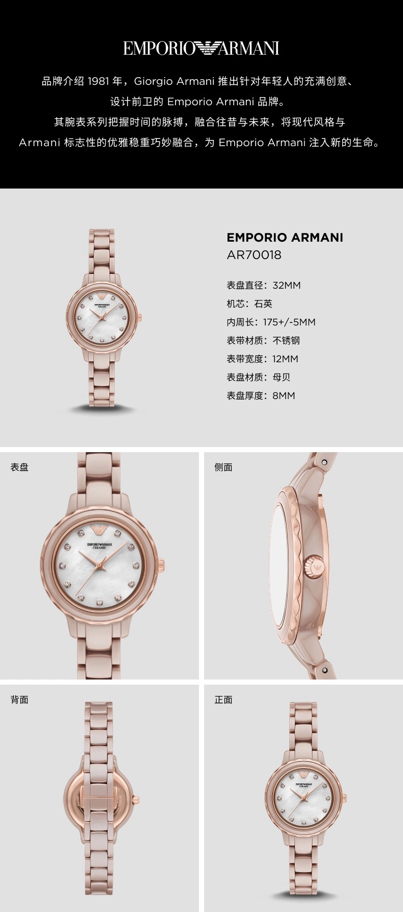 E ARMANI 手表女 AR70018-F .【不退不换,介意勿拍】