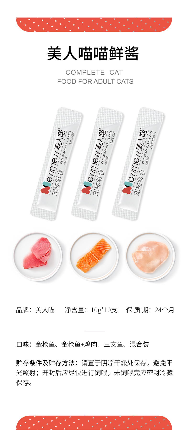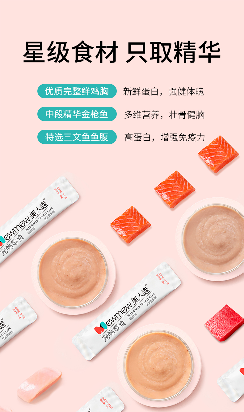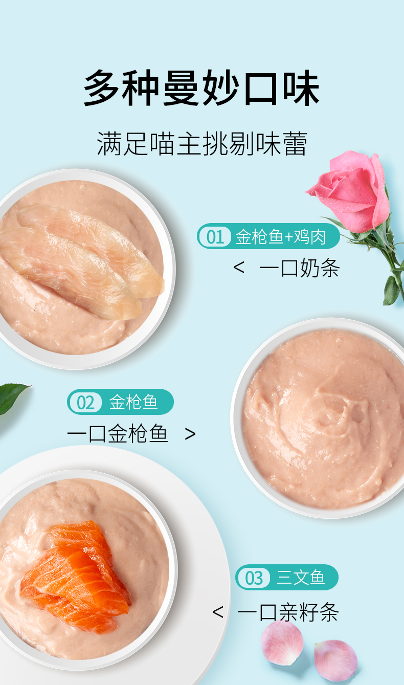| 食品口味: 混合口味【鲜肉营养】 三文鱼【浓稠肉泥】 金枪鱼+鸡肉【营养配比】 金枪鱼【美味补水】 | 原产地: 中国 |