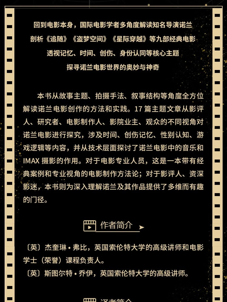 诺兰是当前好莱坞炙手可热的导演之一,他以创新性和独特的叙事结构,打破了传统的主流商业电影和独立电影之间截然划分的界限。本书围绕诺兰在1998年到2014年间的9部知名电影(《追随》《蝙蝠侠:黑暗骑士》《盗梦空间》《致命魔术》《记忆碎片》《星际穿越》等),从故事主题、拍摄手法、叙事结构等角度全方位解读诺兰电影创作的方法和实践。17篇主题文章从影评人、研究者、电影制作人、影院业主、观众的不同视角对诺兰电影进行探究,涉及时间、创伤记忆、性别认知、游戏逻辑等内容,并从技术层面探讨了诺兰电影中的音乐和IMAX摄影的作用。对于电影专业人员,这是一本带有经典案例和专业视角的电影制作方法论;对于影评人、资深影迷,本书则为深入理解诺兰及其作品提供了多维而有趣的门径。