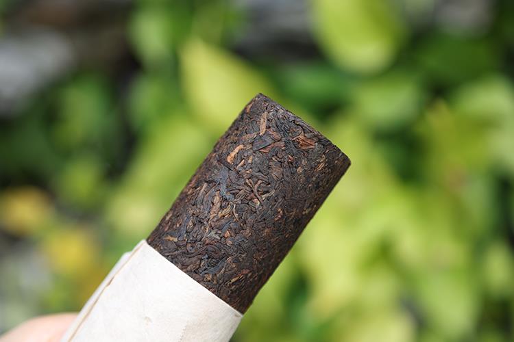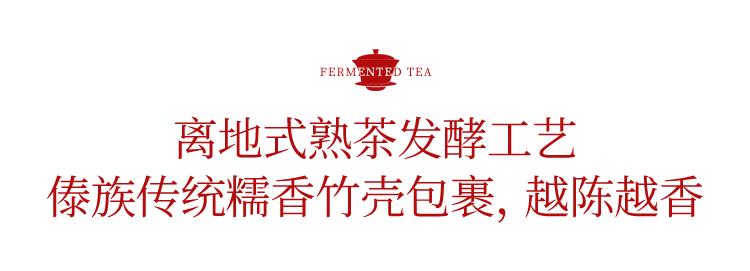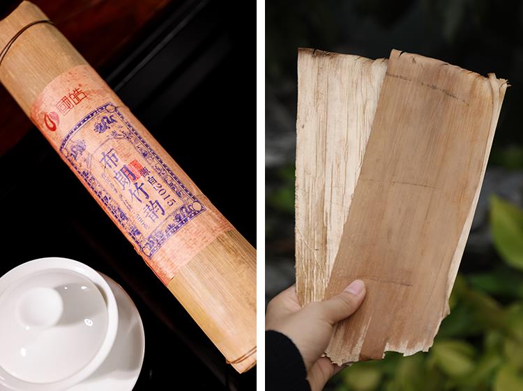 它和平常所见的用棉纸包裹的普洱熟茶不一样,用的是云南傣族传统的糯香竹壳包裹,特别古朴自然。