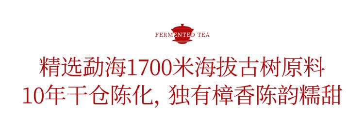 经过10年的时间陈化,汤色红浓透亮,入口润滑香甜,饱满而爽口,独特的樟香陈韵带糯甜感,韵味十足,真的一口难忘。