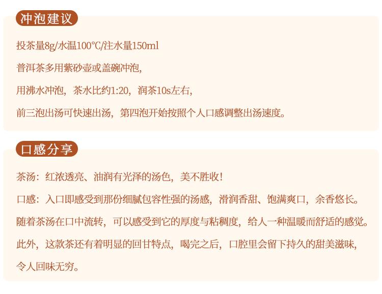 这里出品的茶,自然入喉韵味充沛,老茶气息丰富,醇和甘甜,润滑、厚重,回甘快而持久。