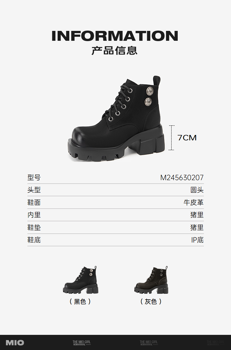 MIO米奥冬季圆头高跟户外靴牛皮革酷飒显高厚底马丁靴女靴M245630207